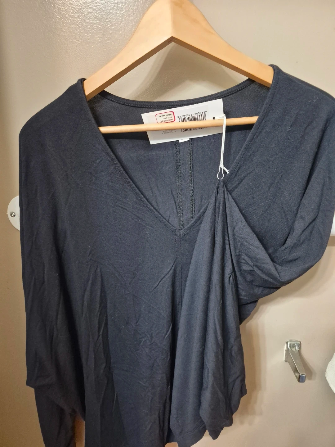 This is a women's black long sleeve top with a V-neck. It's made of a soft, comfortable material. The neckline is designed with a flattering drape.