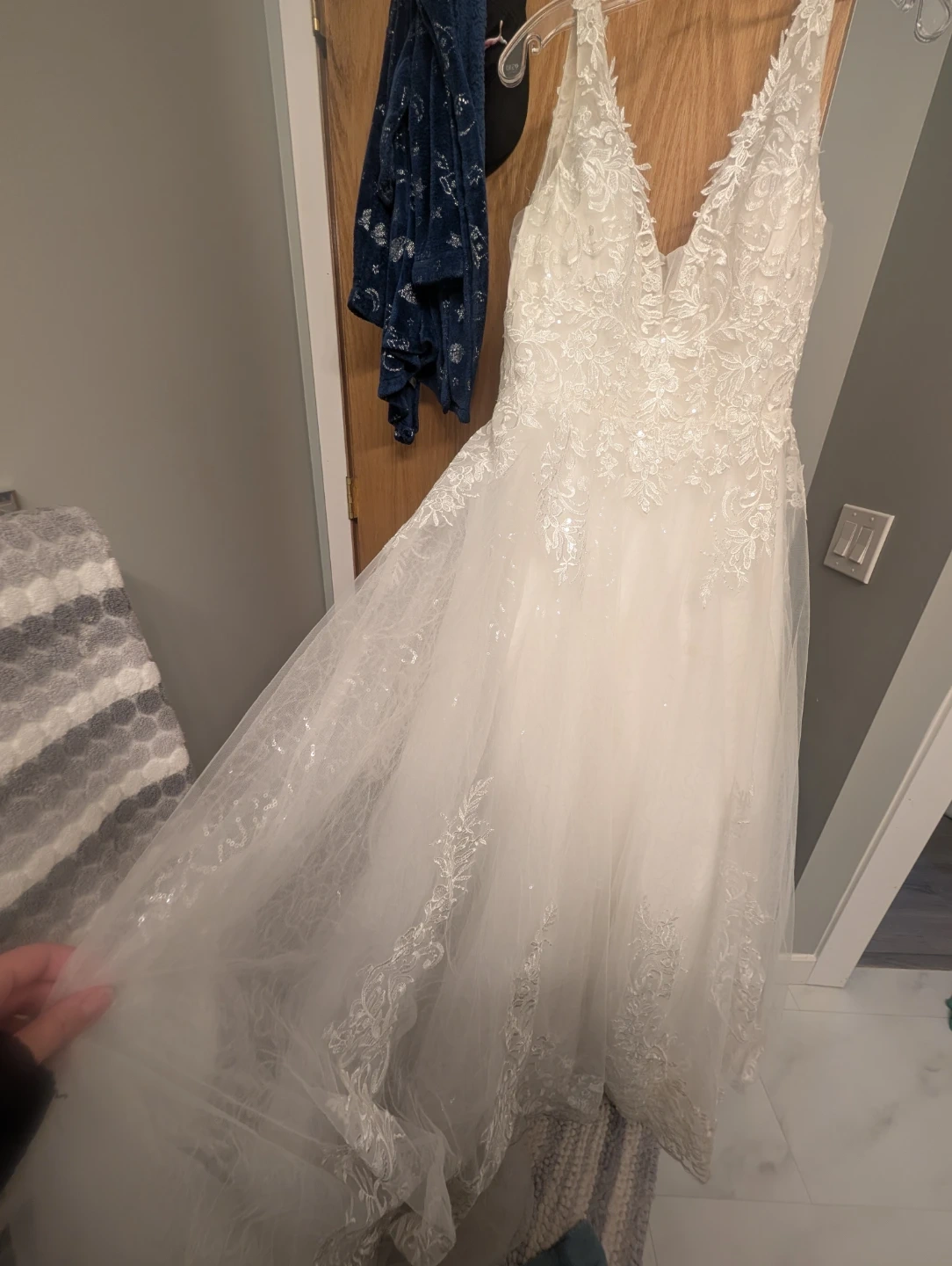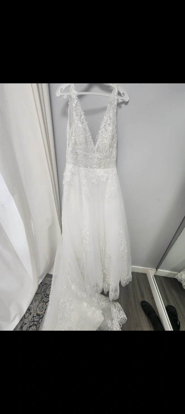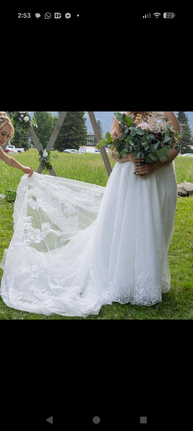 Beautiful white lace wedding dress with a flattering v-neckline and intricate detailing. It features a corset back for an adjustable fit and a stunning train for added elegance. Corset adjustable back and button up train. Needs to be professionally cleaned. Pickup in spruce grove or can meet west edmonton.sized for a women 5'2/5'3 height
