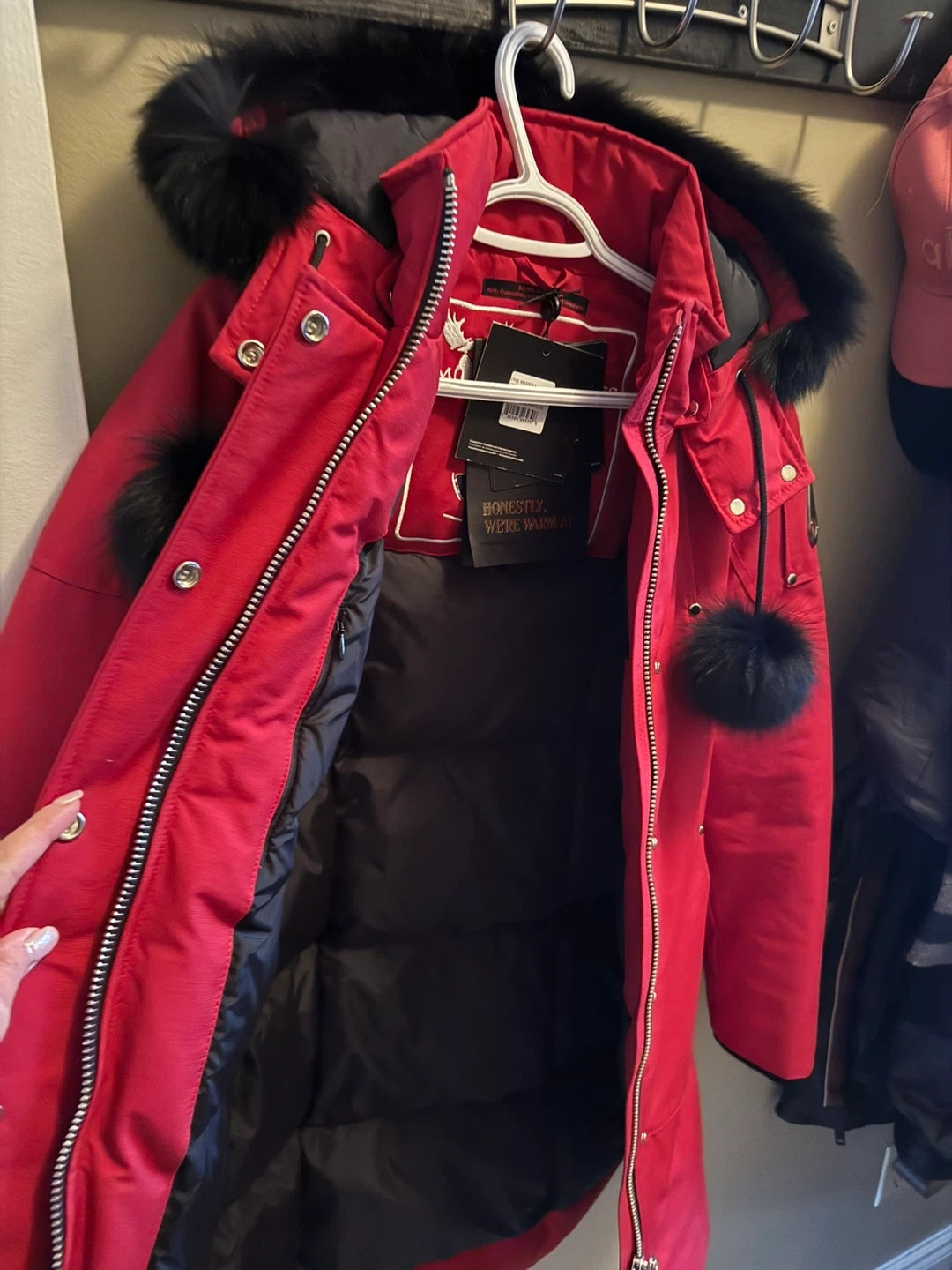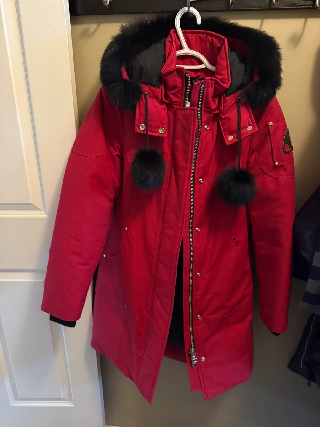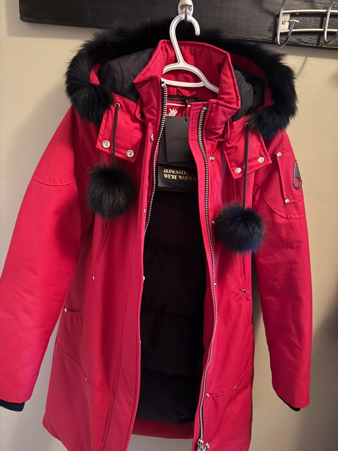 Red Moose Knuckles puffer jacket with black fur trim on the hood. It's designed for cold weather. Jacket has pom-poms on the hood drawstrings.
