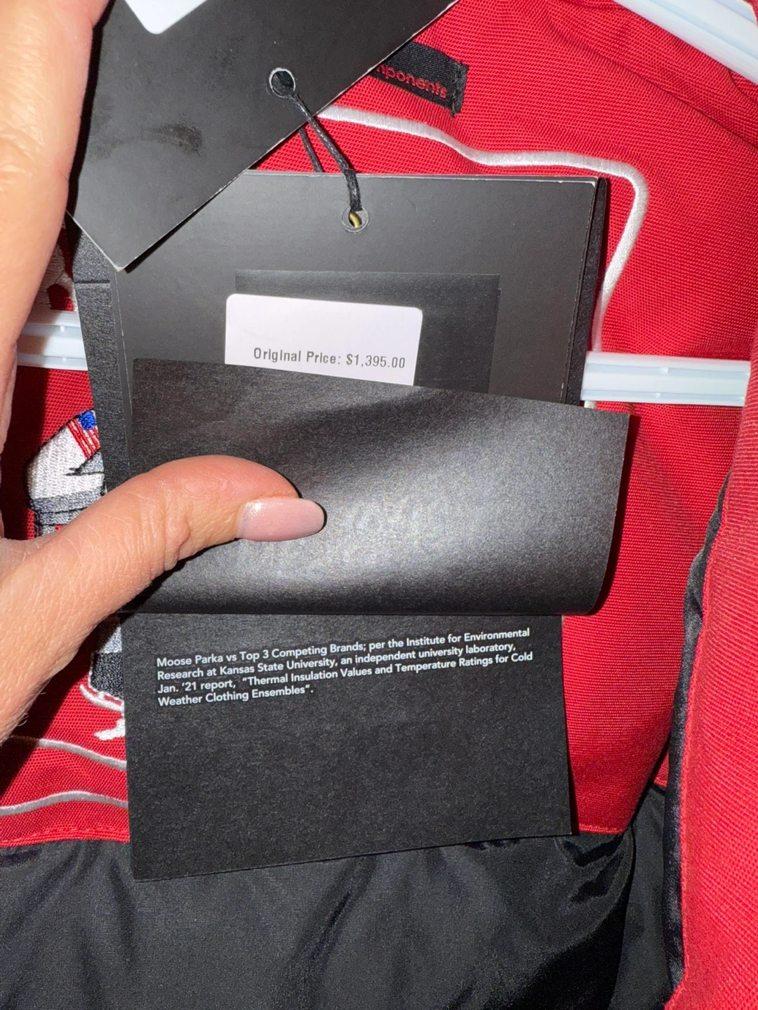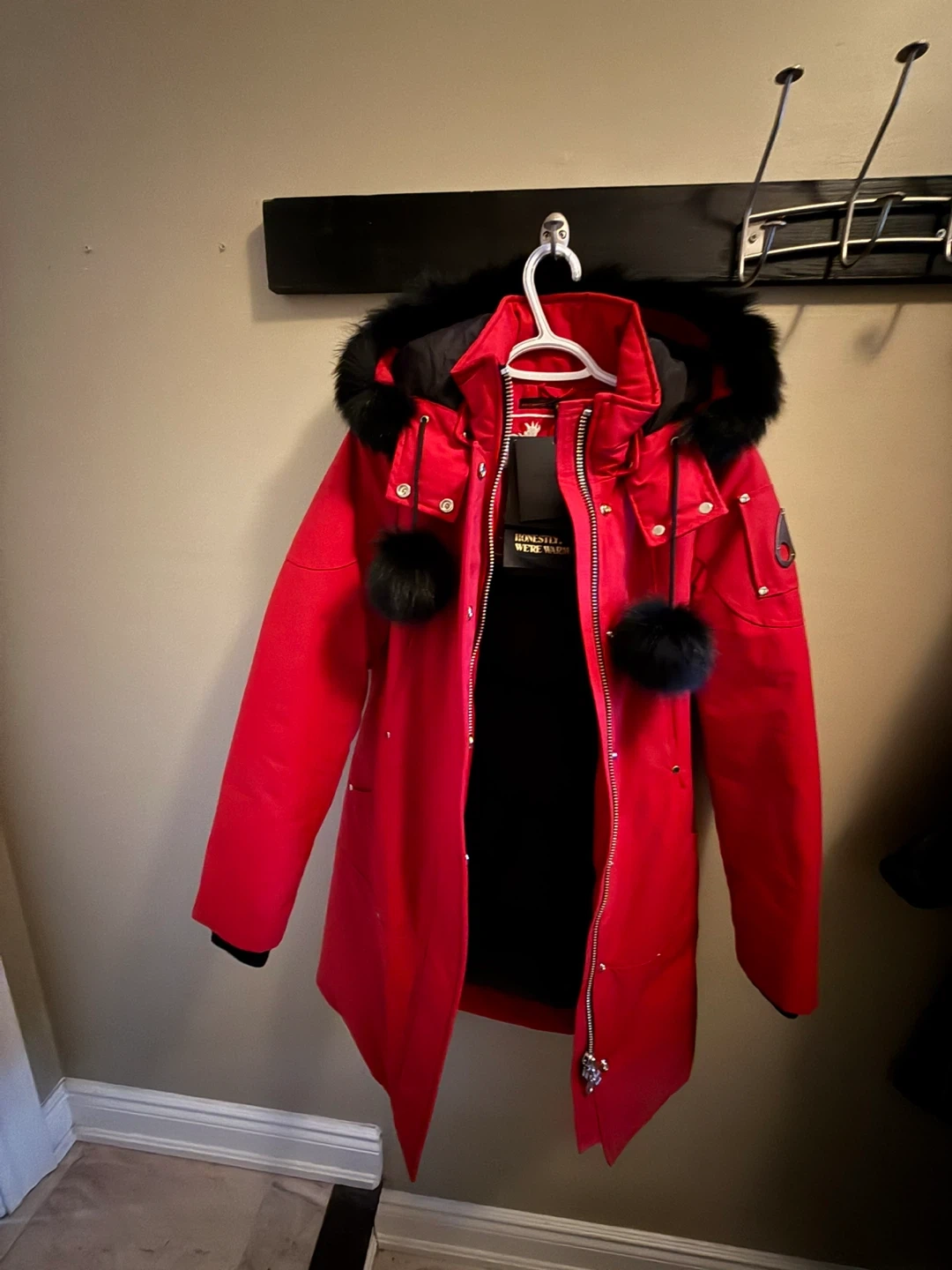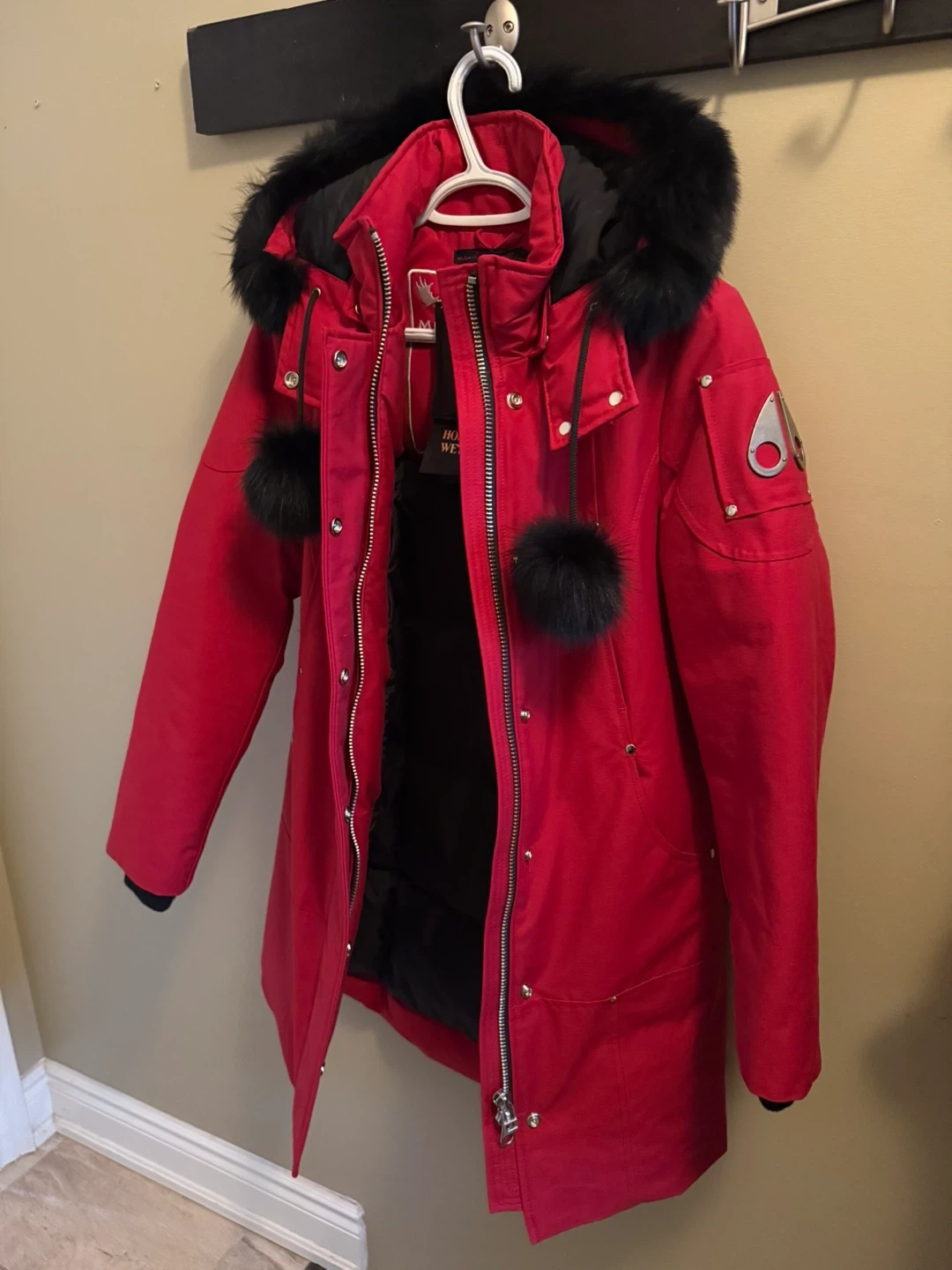 Red Moose Knuckles puffer jacket with black fur trim on the hood. It's designed for cold weather. Jacket has pom-poms on the hood drawstrings.