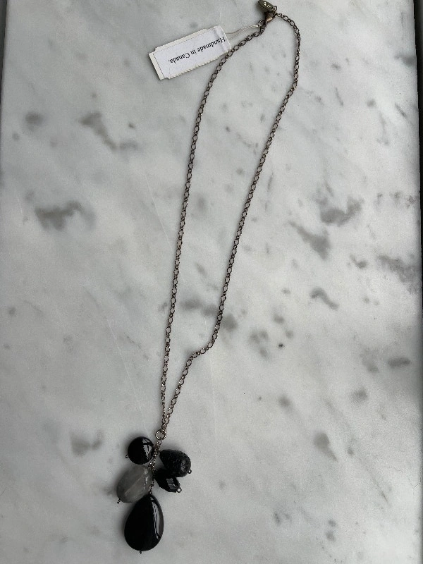 This is a new, never worn sterling silver necklace with natural black stones by F2G, made in Canada. The chain measures about 44 cm. The sterling silver chain shows some light tarnishing but can be polished. The necklace was a gift and has never been worn (still has the original tag). Asking $35. Pickup at Davisville station.