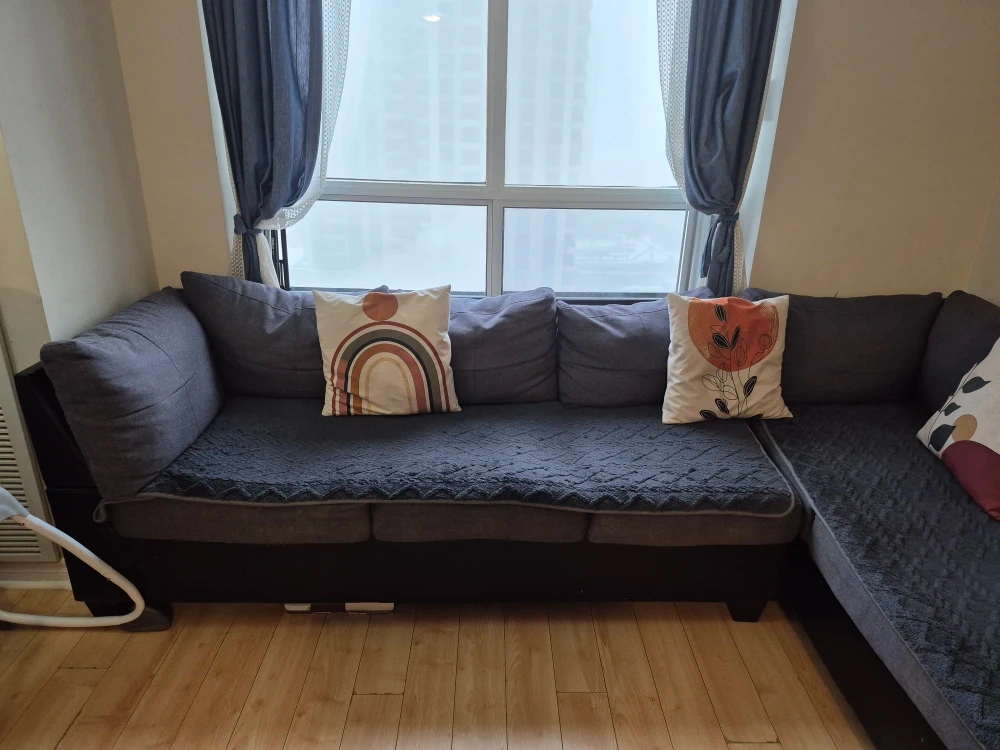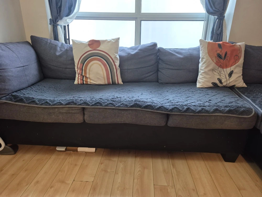 Selling our modern grey and black 6-seater sectional with matching ottoman. This was originally $700, but we are priced low for a quick sale due to space constraints, perfect for a family room or basement.