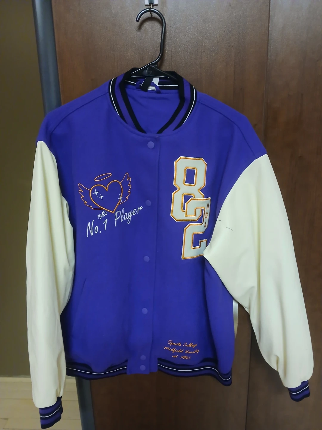 Varsity jacket with 'Sports College Midfield Varsity est. 1982' embroidery. It features a 'No. 1 Player' graphic with a heart and wings. Snap button closure.