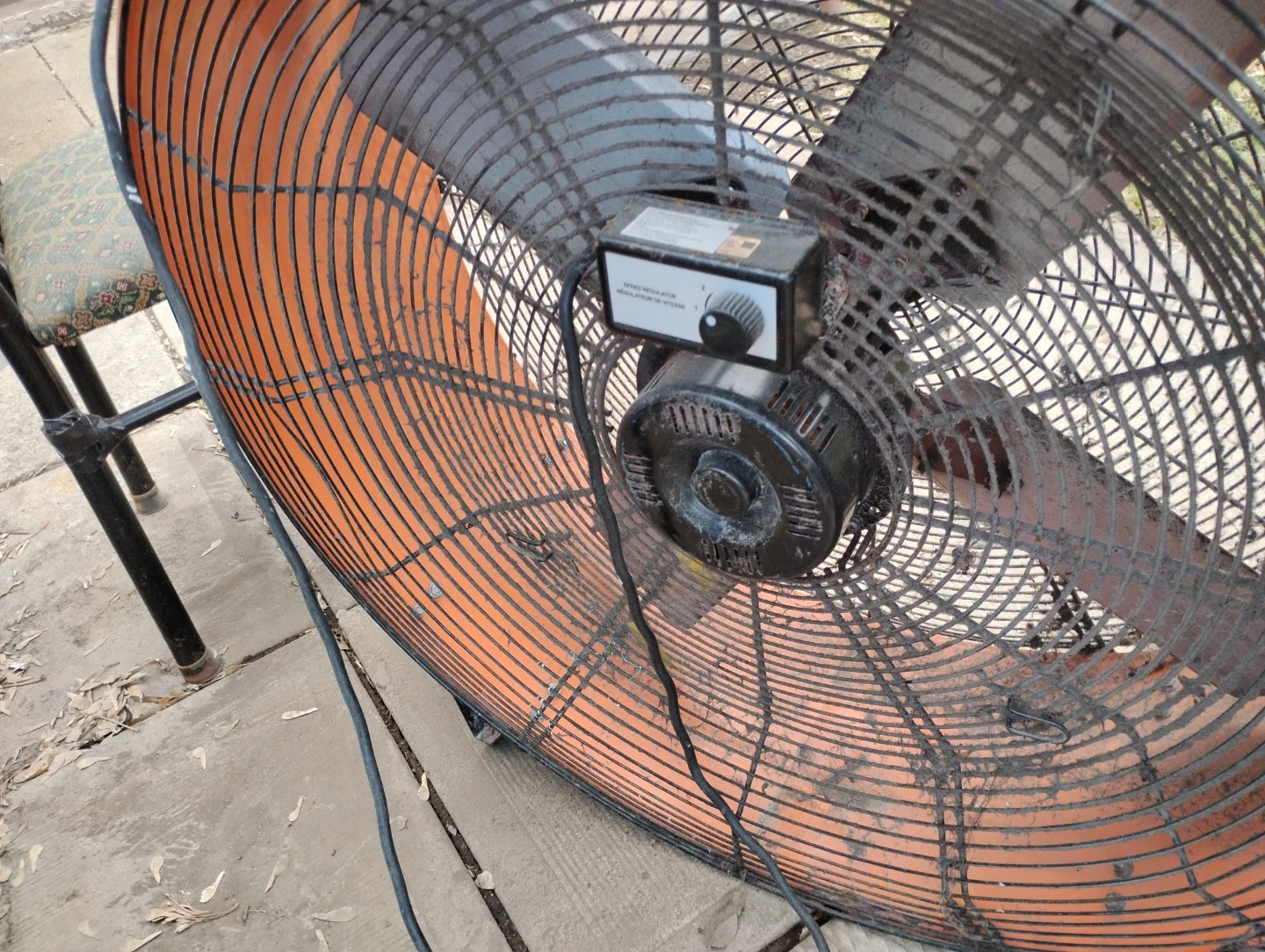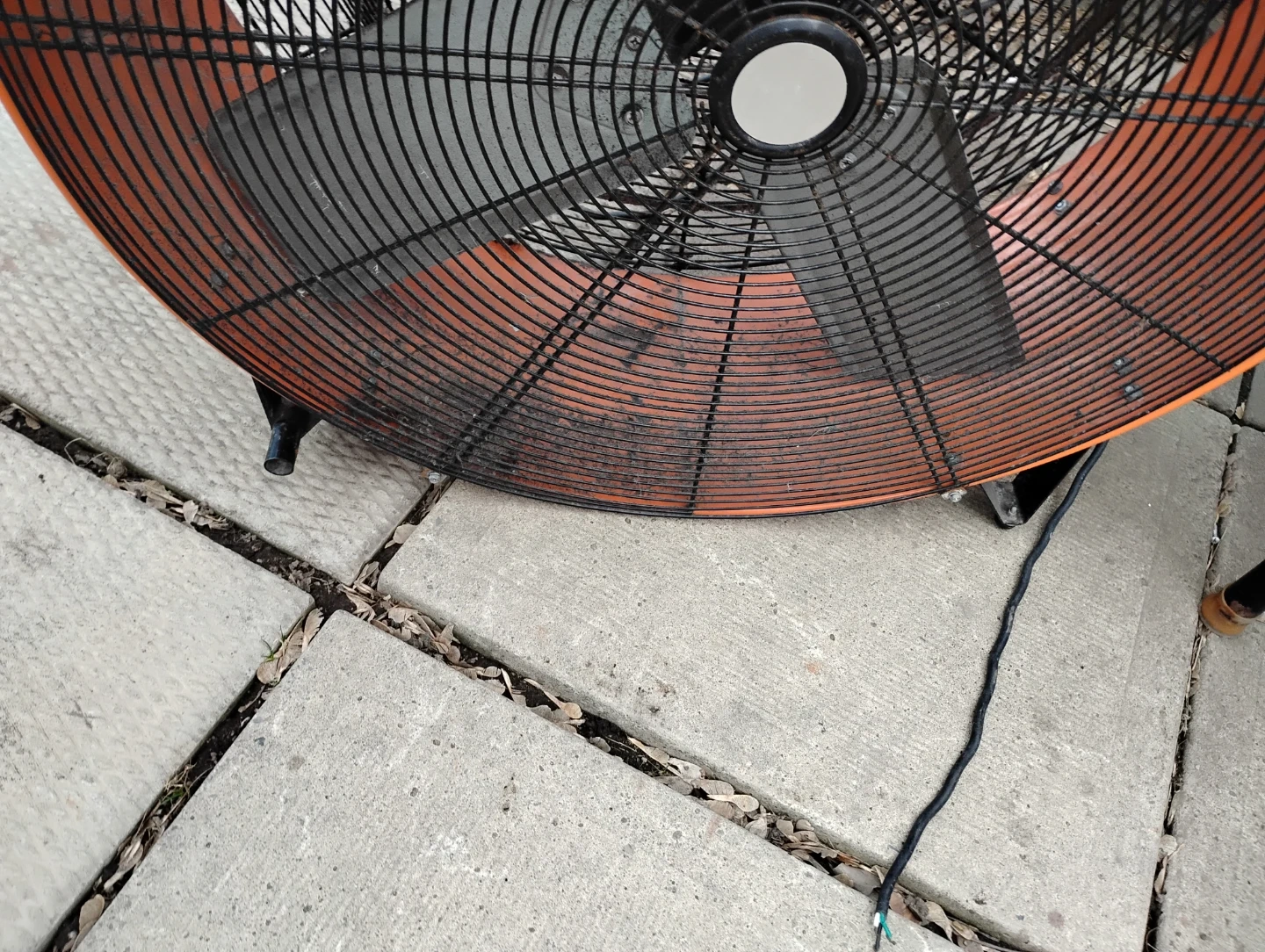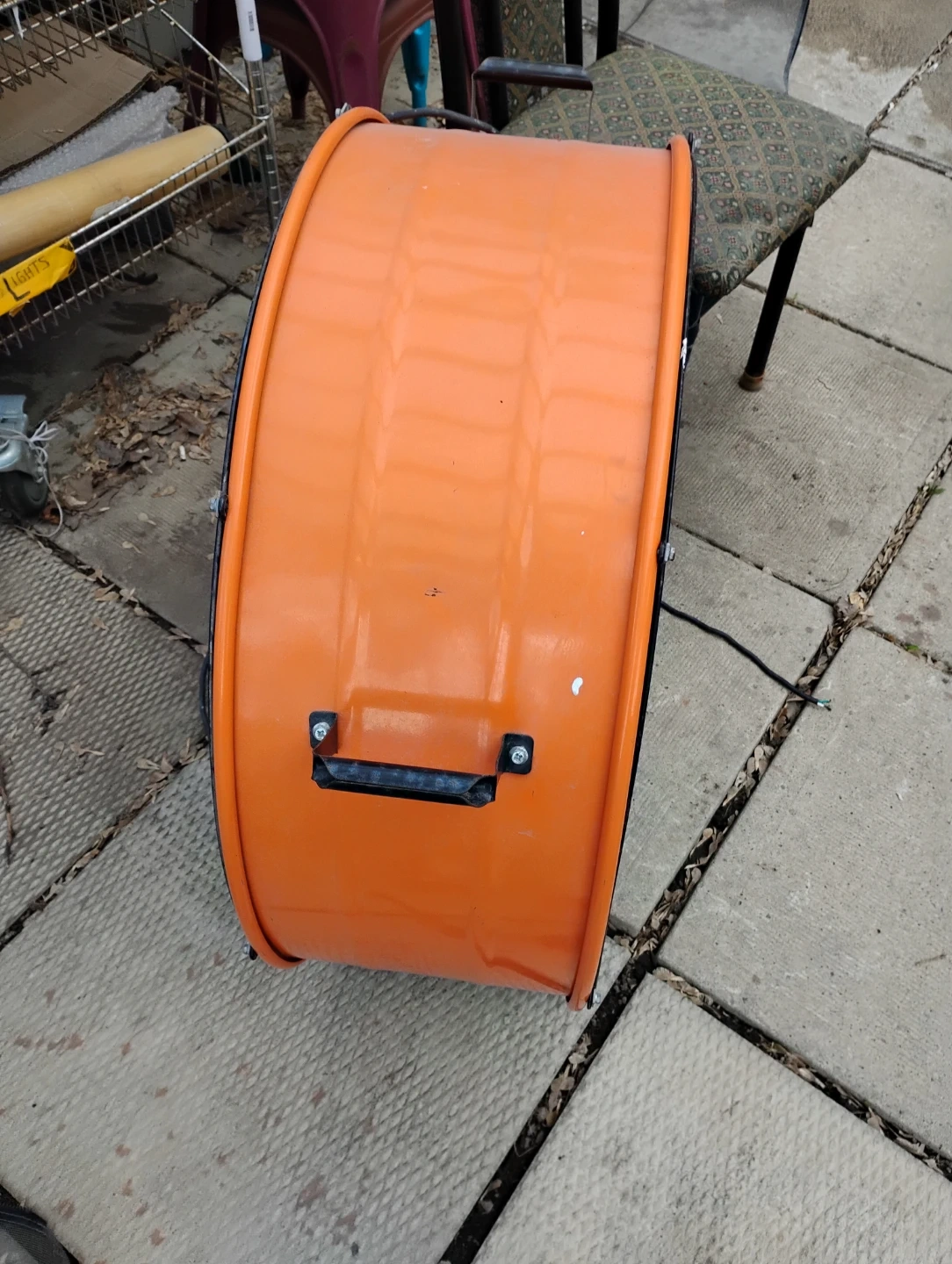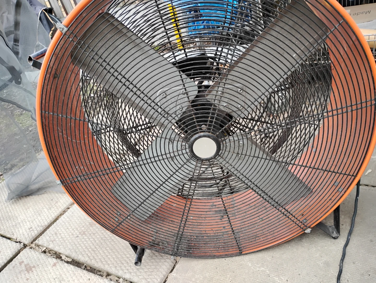 This is a large, orange industrial drum fan. It has a metal grille and a speed regulator. It's great for moving a lot of air in workshops or garages.