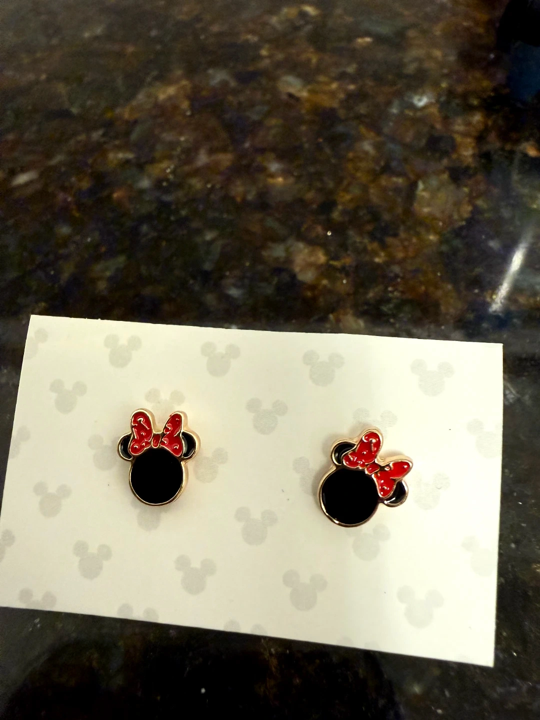 Cute Minnie Mouse stud earrings with red bows. These are great for adding a touch of Disney magic to any outfit!