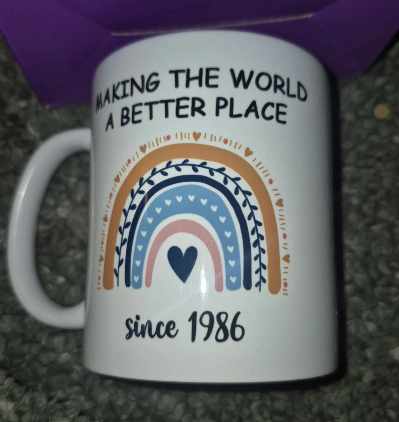 This is a ceramic coffee mug with a fun rainbow design. It says 'Making the World a Better Place' and 'since 1986'. The mug comes in a purple box that says 'Best Gift For You'. It's dishwasher and microwave safe.