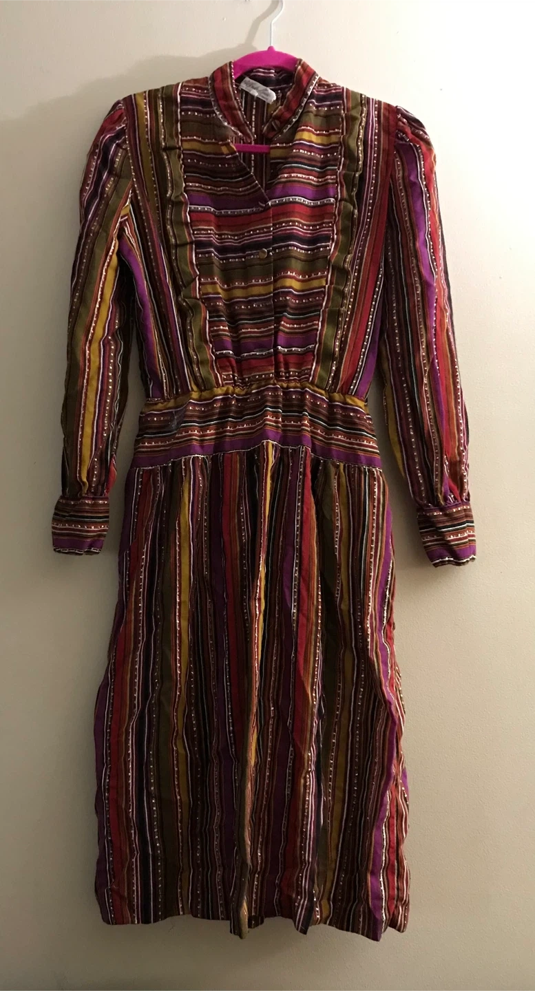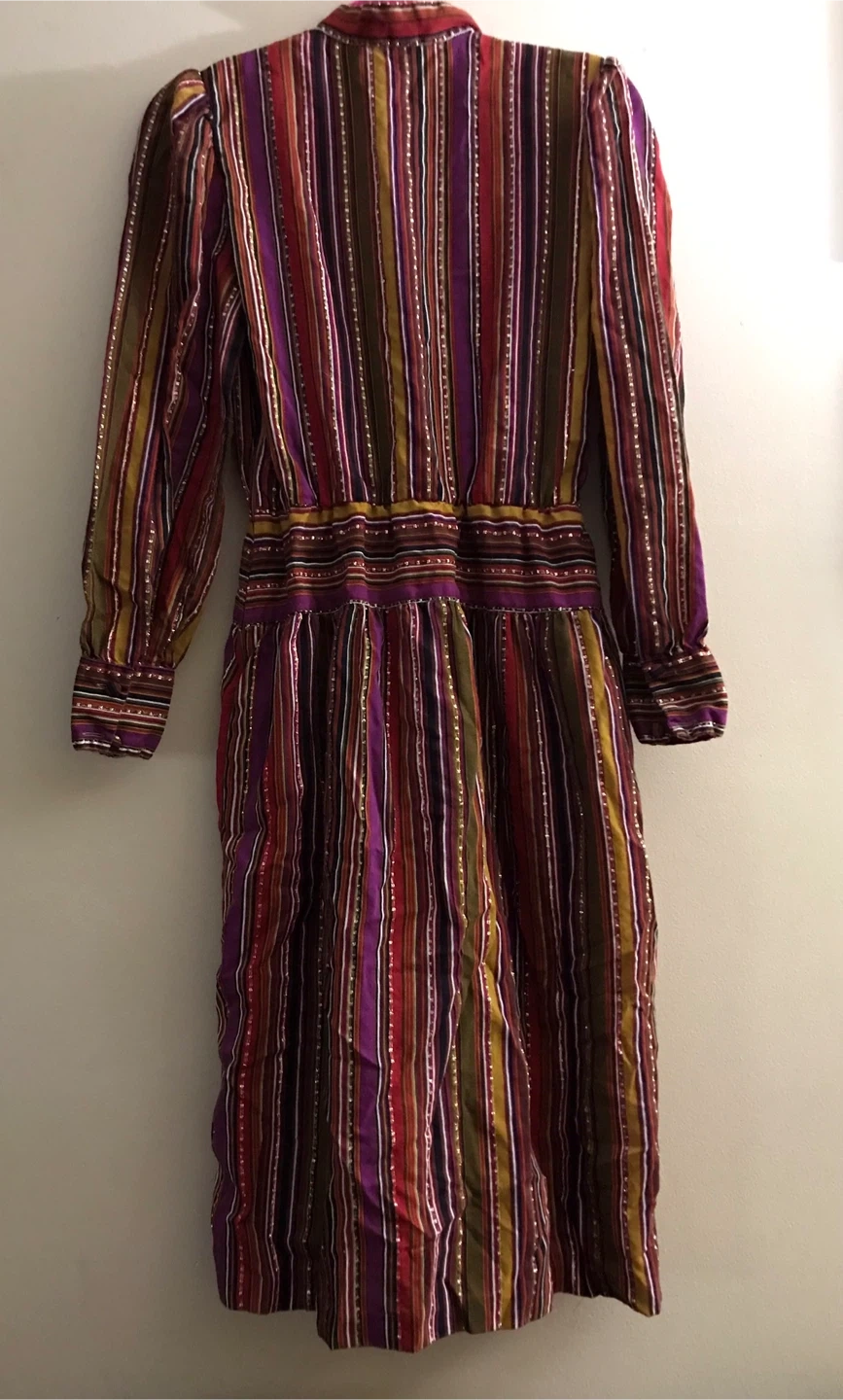 This is a beautiful vintage Alfredo Zocci women’s dress, size 46. This dress features a unique striped pattern with long sleeves. The dress is in used condition, but it has been well-maintained and has lots of life left in it. It’s a lovely piece for anyone who appreciates vintage fashion.