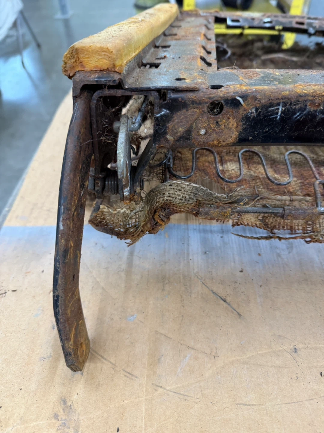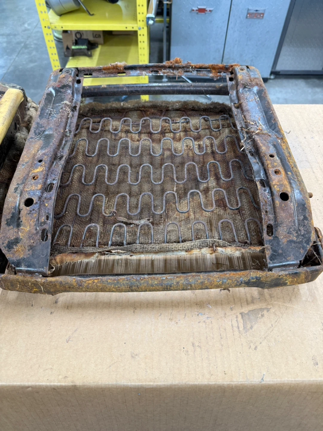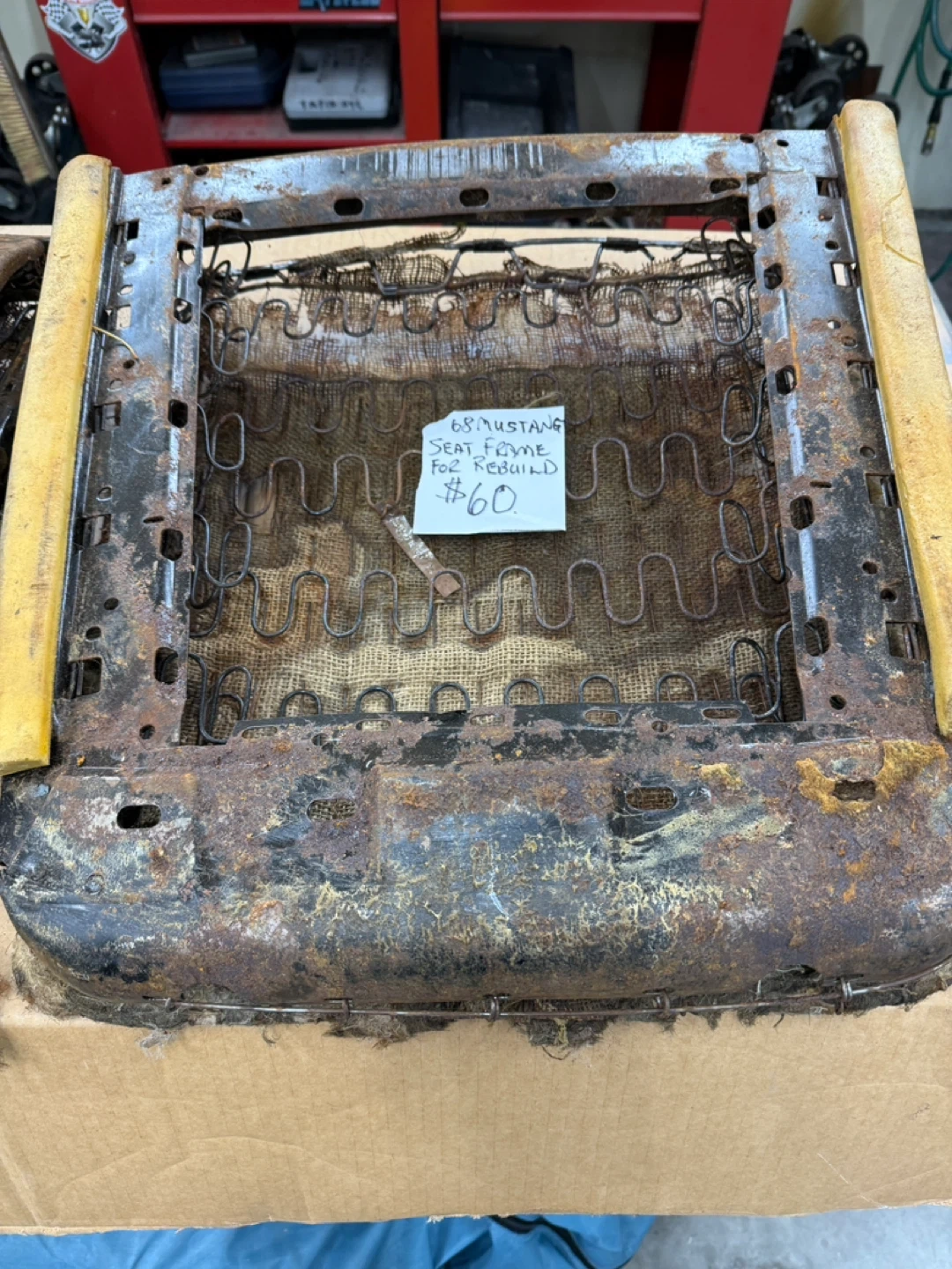 Original 1968 Ford Mustang seat frame. Metal frame with springs and burlap seat base. Shows significant rust and wear, sold as-is for rebuild. 54th ave 248th st Aldergrove BC