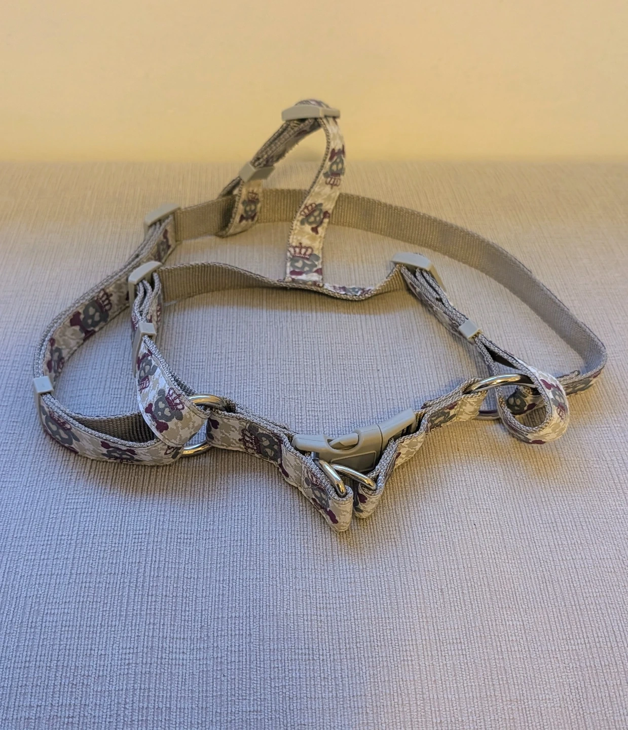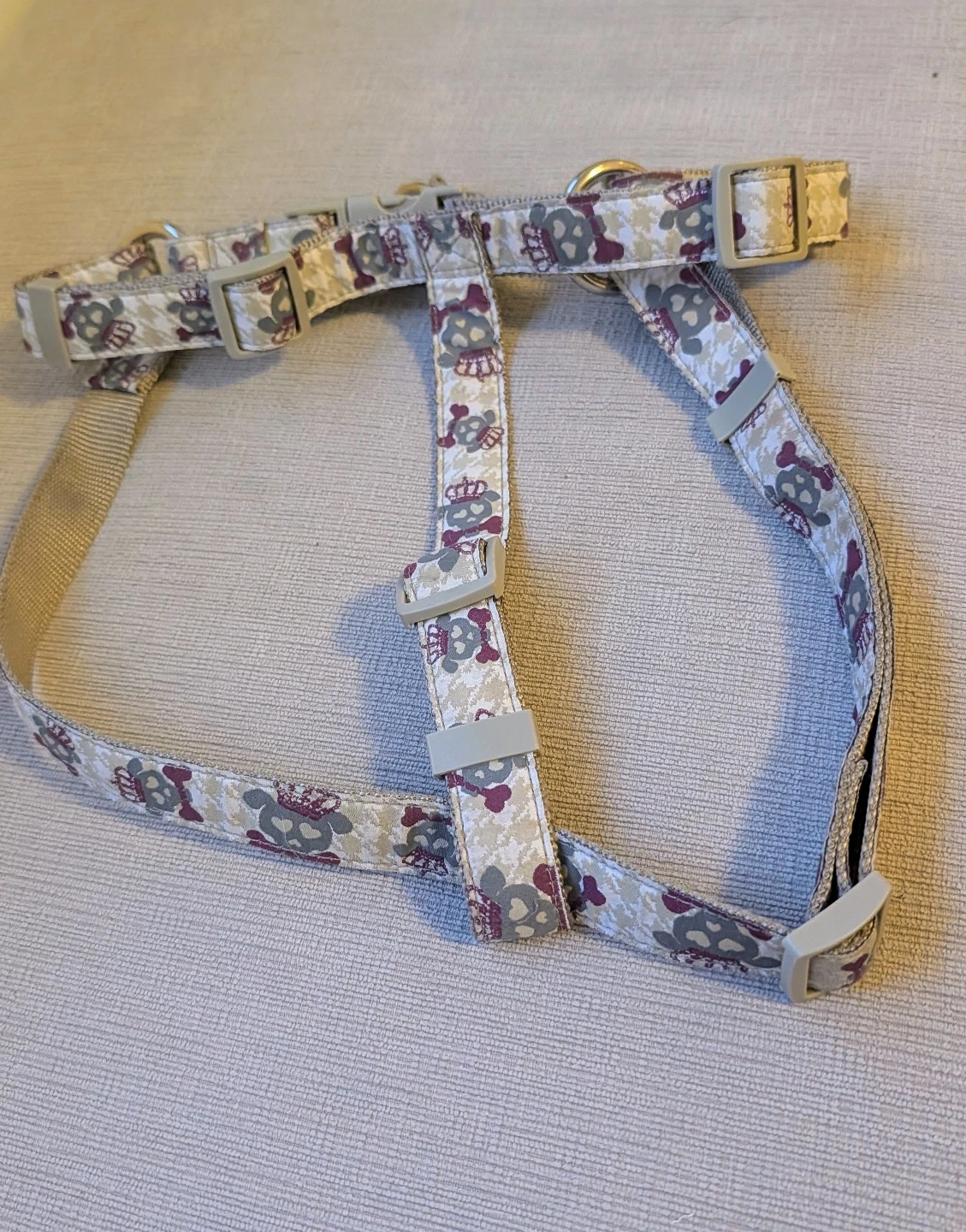 This dog harness features a fun skull and crown print. It's made with durable nylon webbing and has adjustable straps for a comfortable fit. Multiple D-rings are present for leash attachment.