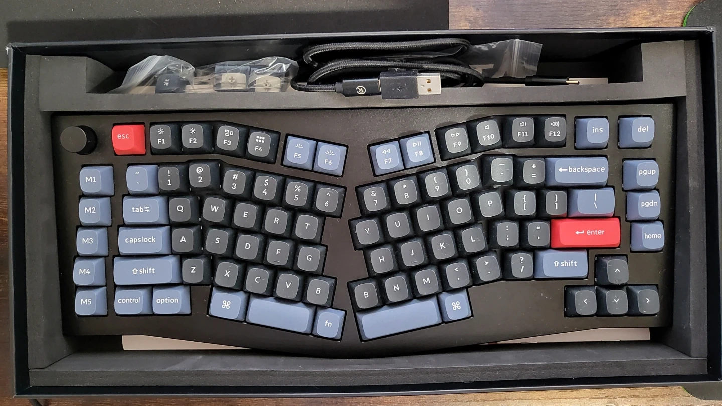 This is a Keychron Q10 75% mechanical keyboard with a knob. It's an alice layout full aluminum keyboard. It comes with a USB cable and extra keycaps. It has two small scratches in the back. Otherwise, it's in excellent condition and fully functional. Originally bought for $249.99 plus tax. Price is firm since I priced reasonably considering its condition.