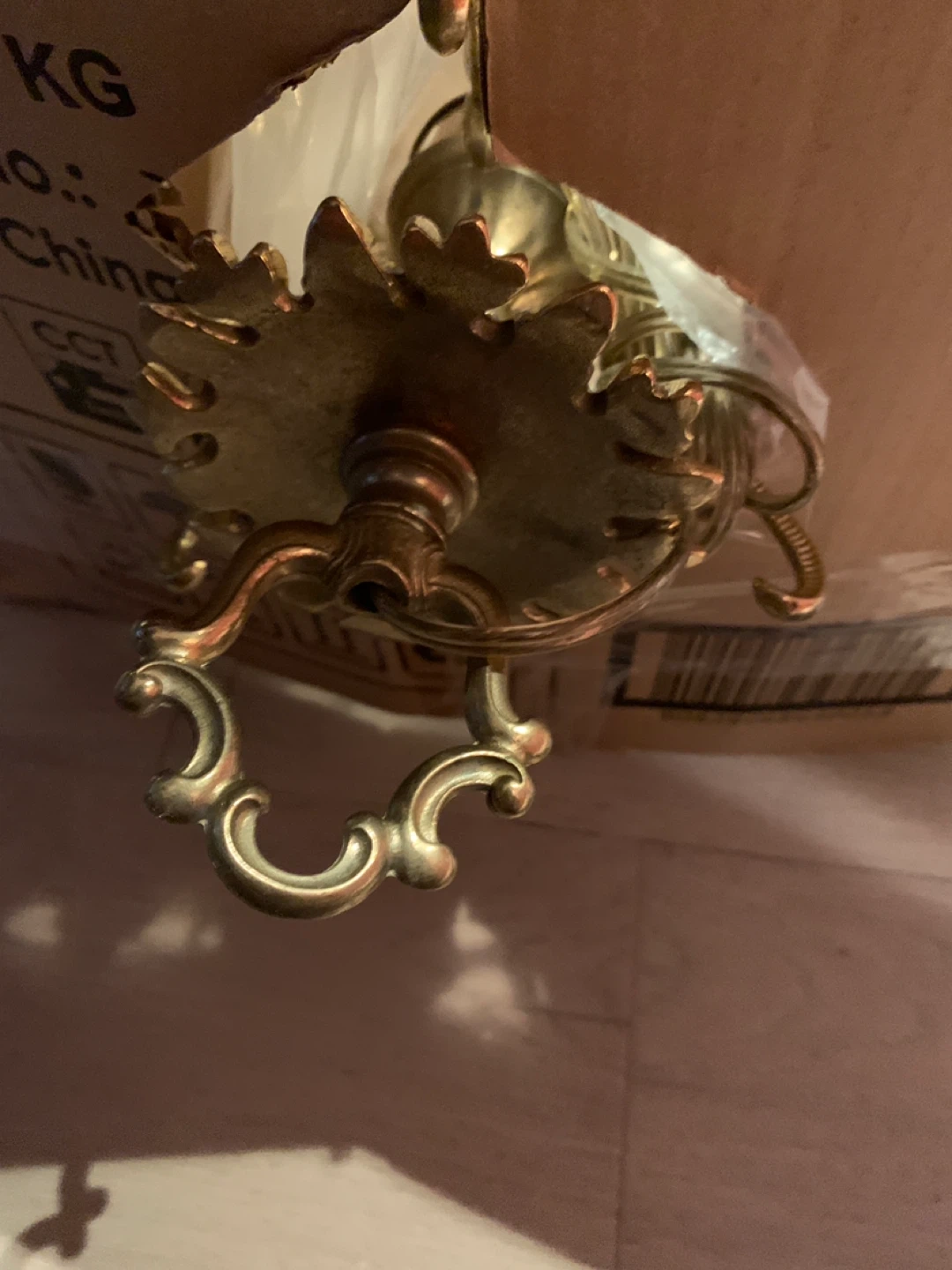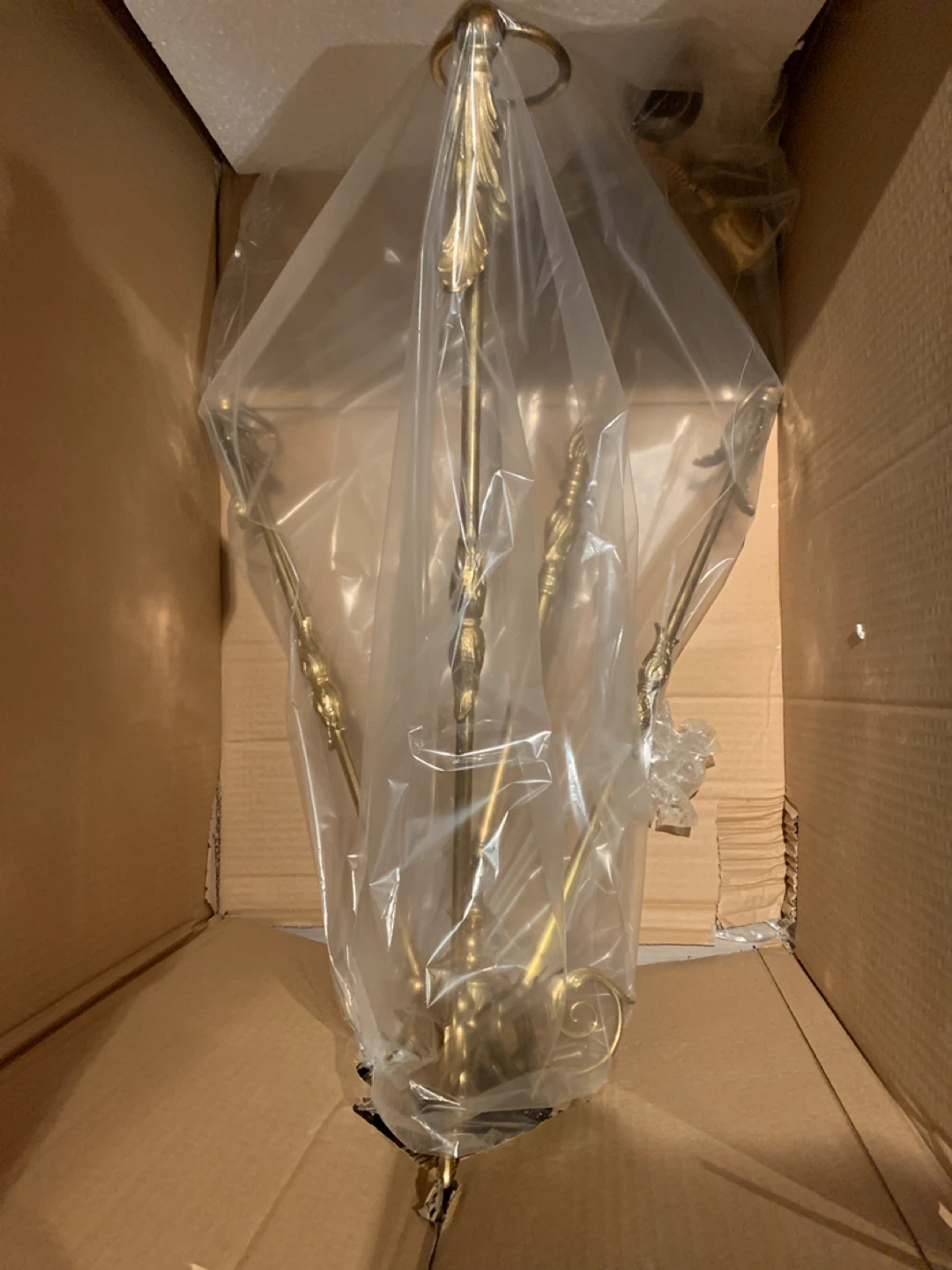 Selling a brand new gold chandelier still in its original box! It's a beautiful piece that would add a touch of elegance to any room. It's in perfect condition, never been used. Comes with all the original components and instructions.