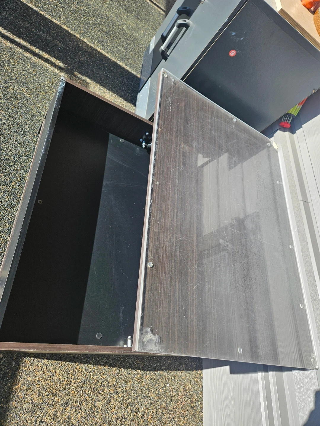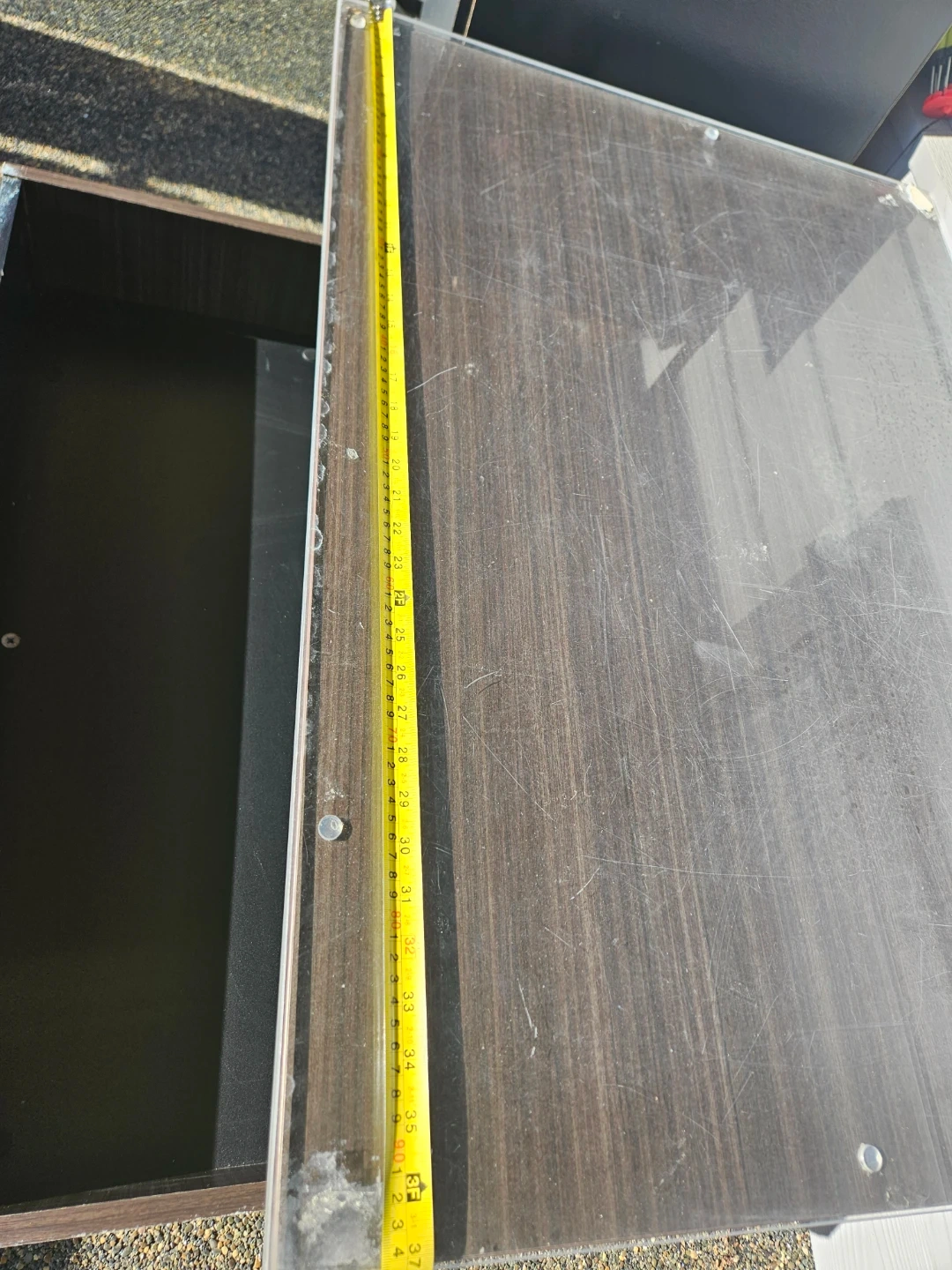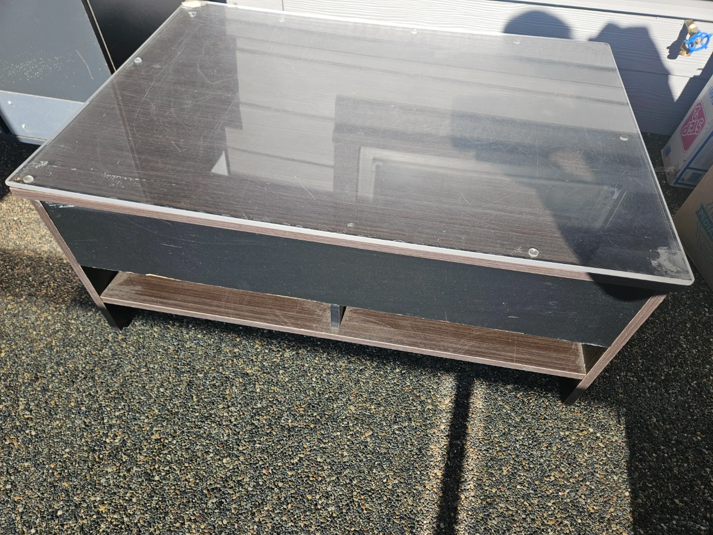 Dark wood coffee table with glass top. Has a two‑section lower shelf for storage. Clean, modern style and still in good condition. Ideal for living room, condo, or office use