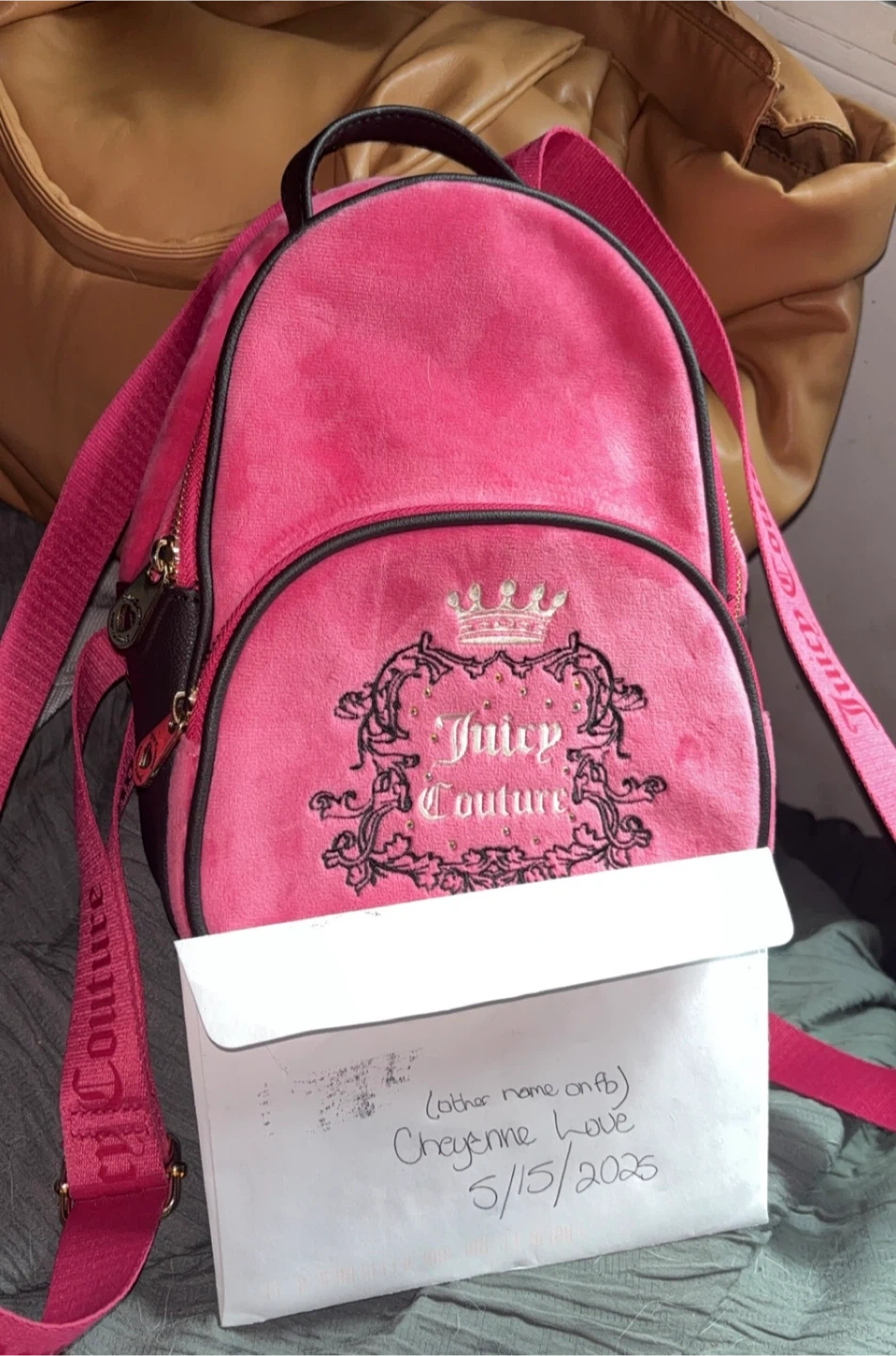 This is a Juicy Couture backpack. It's made of soft pink velour material. It has adjustable straps and a front zip pocket. This backpack is a fun accessory for everyday use!