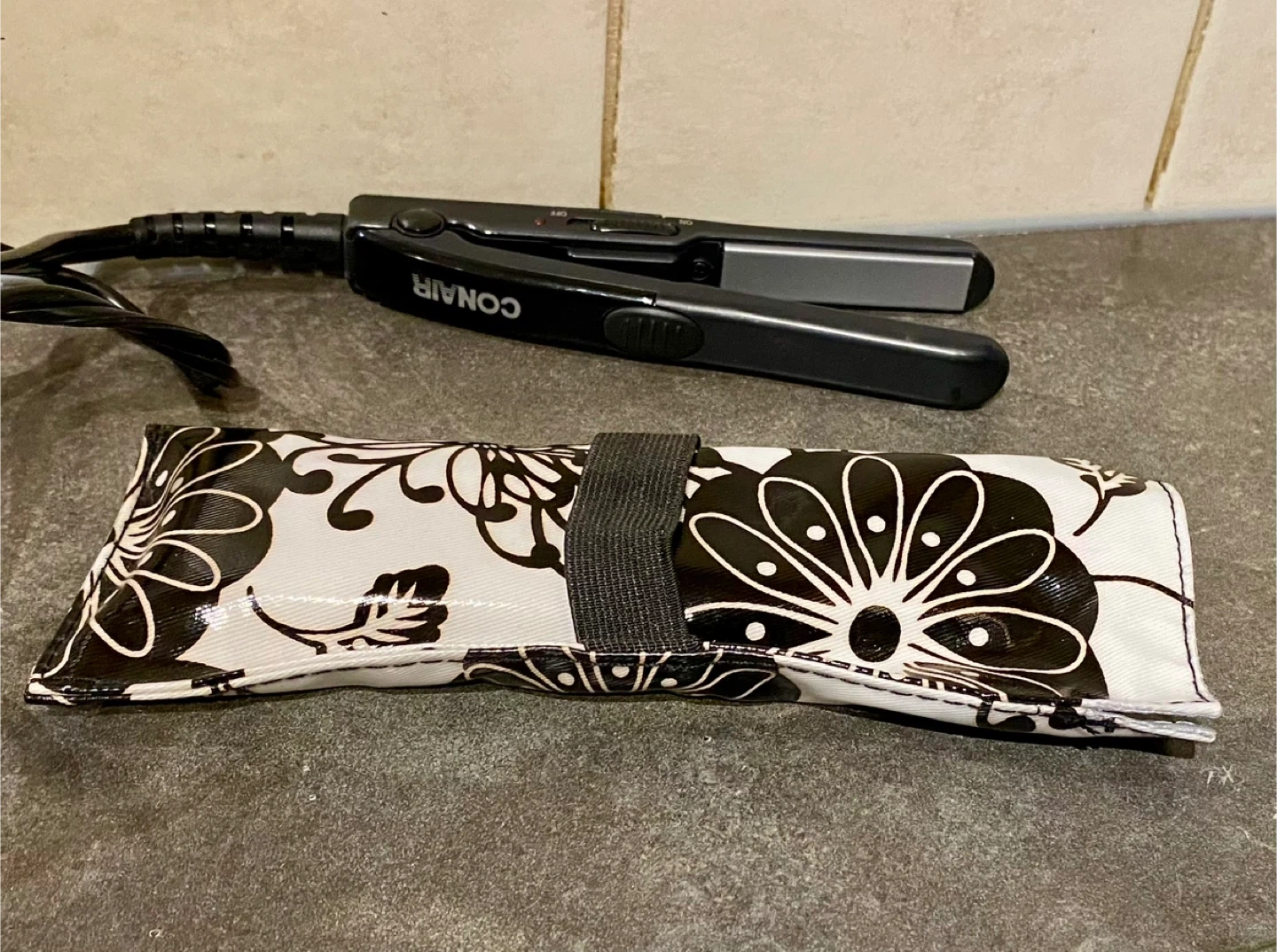 This Conair compact hair straightener is great for travel. It comes with a stylish black and white floral print case to keep it protected. Easy to store and use on the go! Bought it but don’t use it .