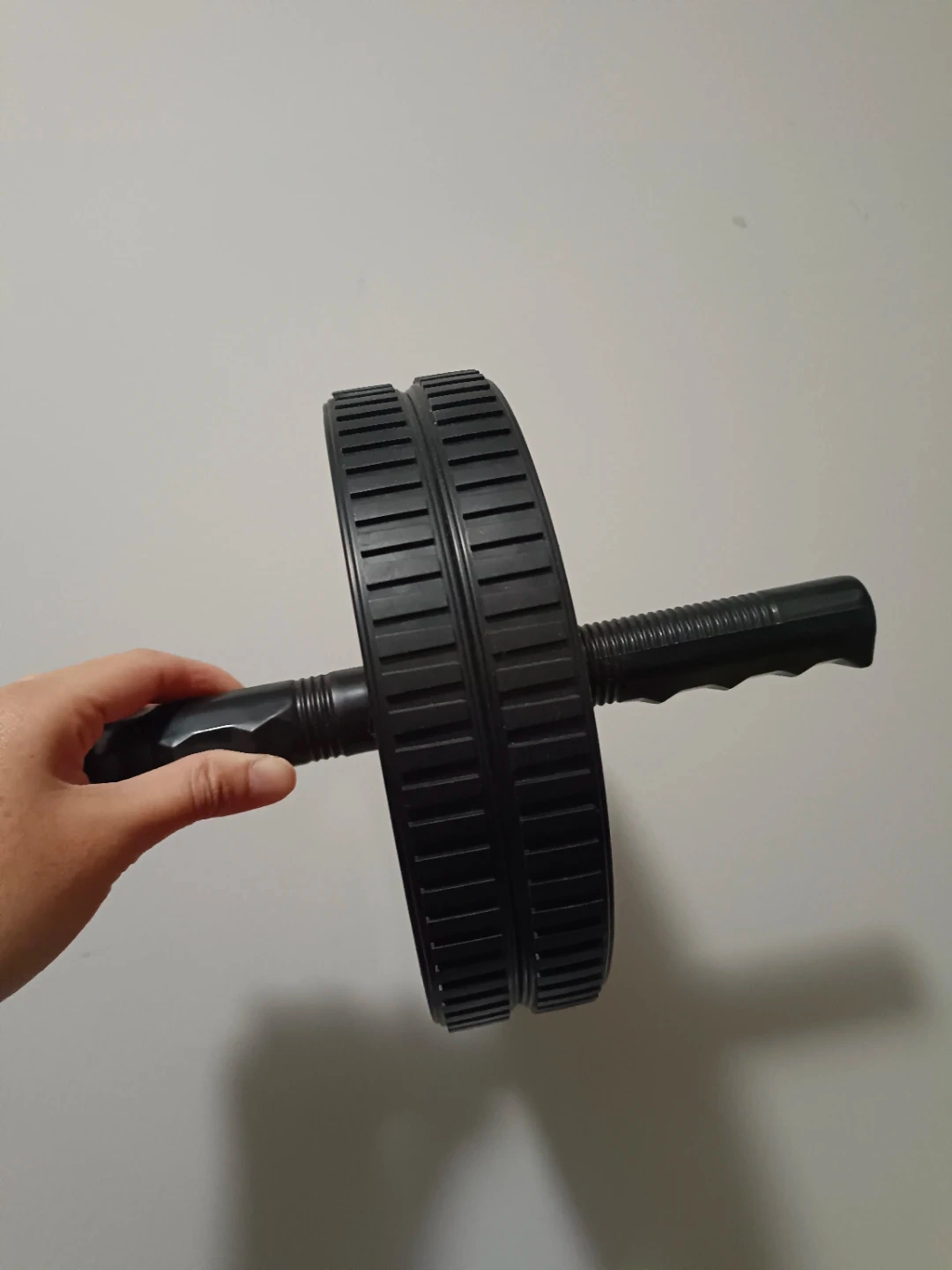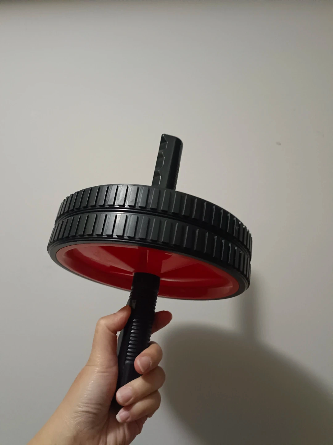 This ab roller wheel features a durable black ribbed wheel for stability and grip. It has comfortable black handles for a secure hold. Suitable for core workouts at home or in the gym!