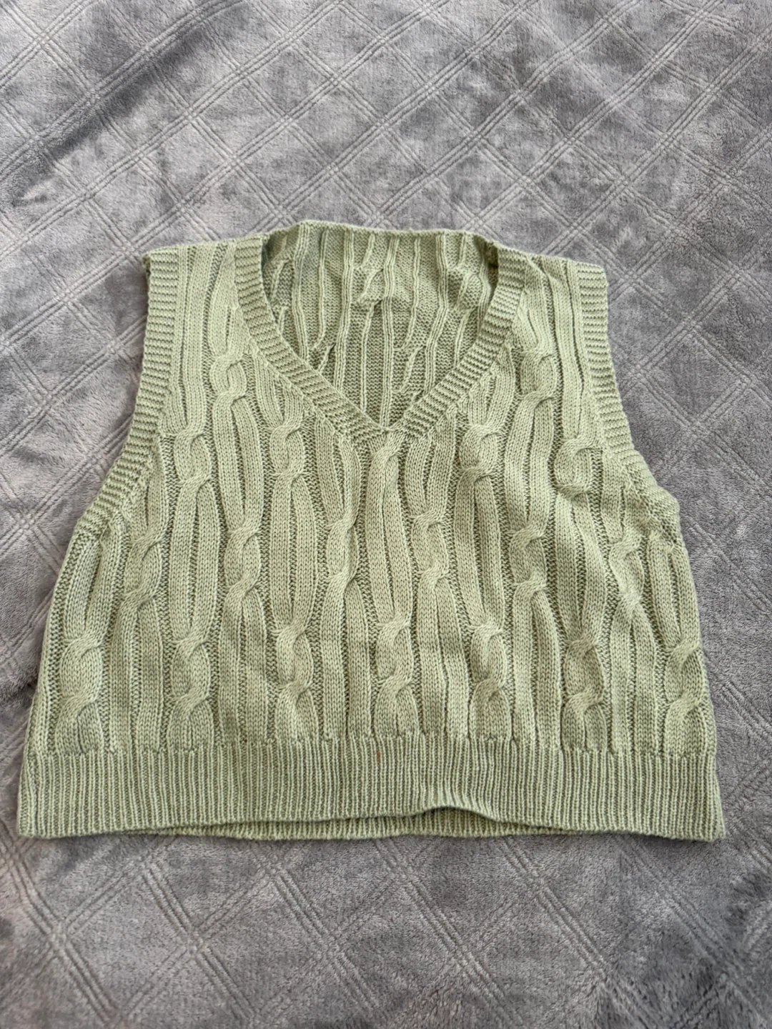 slightly cropped Light green cable knit vest with a V-neck. Sleeveless design. This vest's knit pattern adds a touch of texture. Had it for a while and never wore.