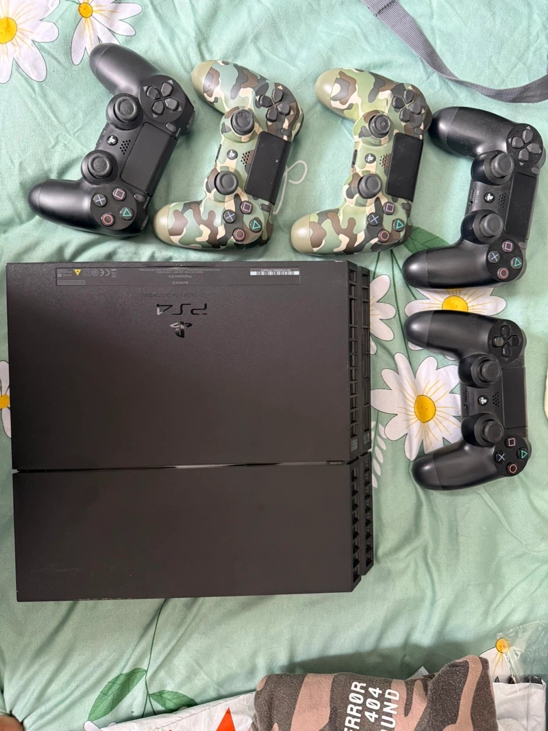 Sony PlayStation 4 console with 2 controllers. Two black controllers.