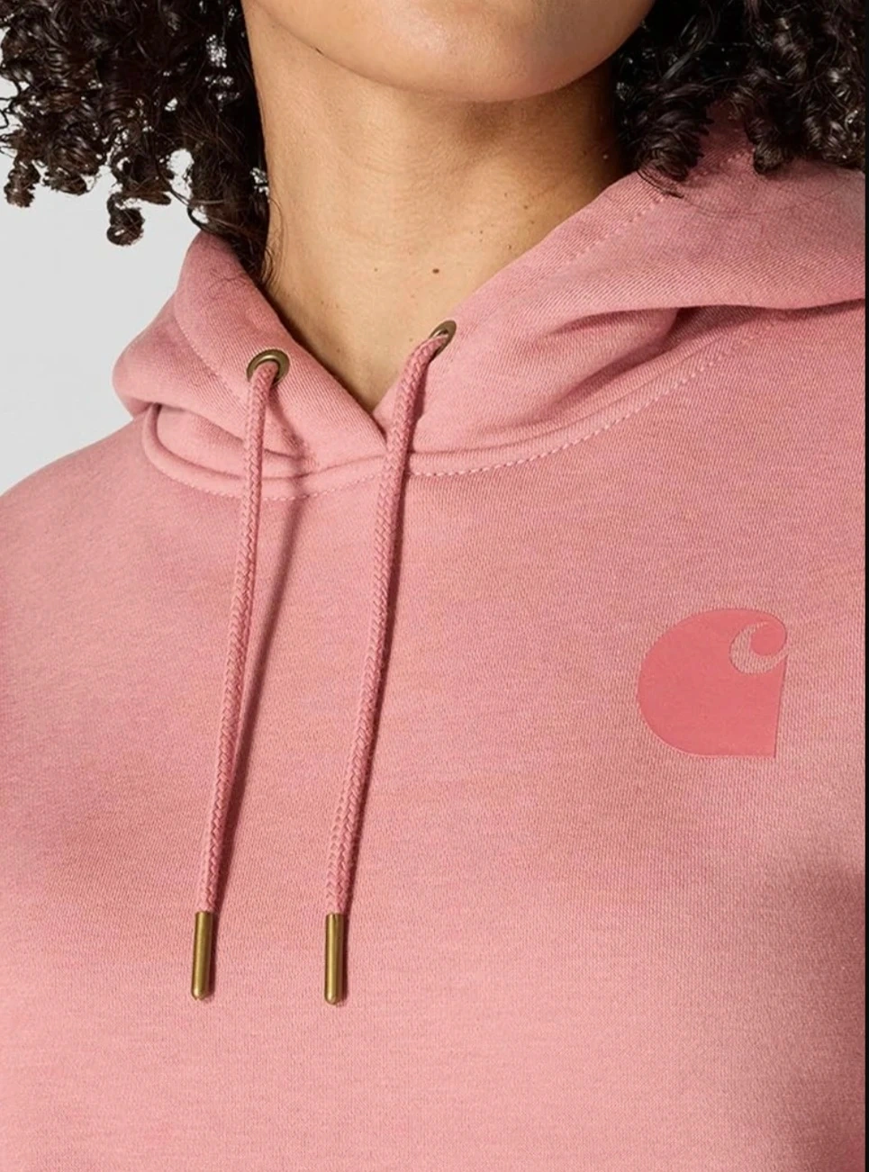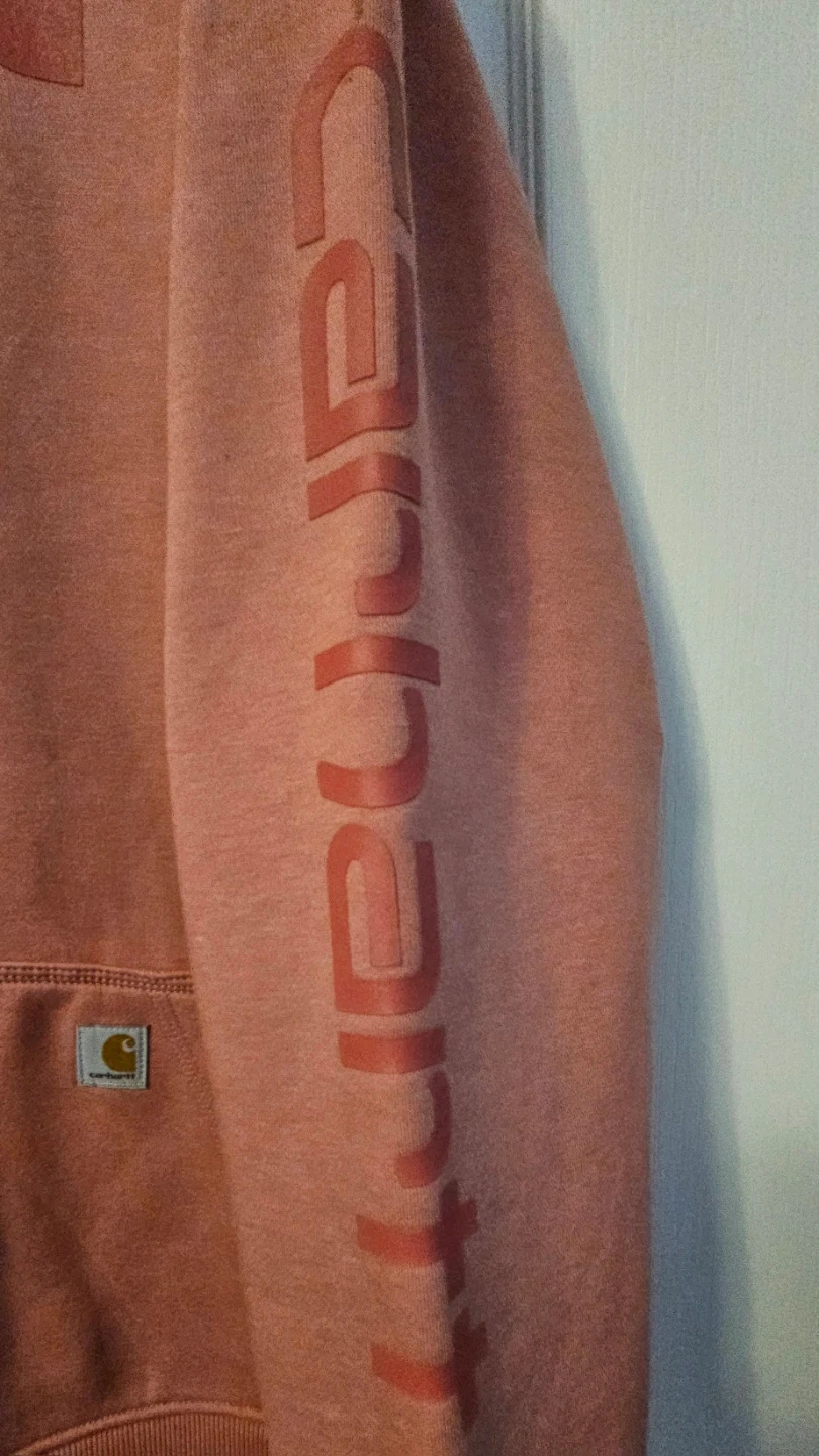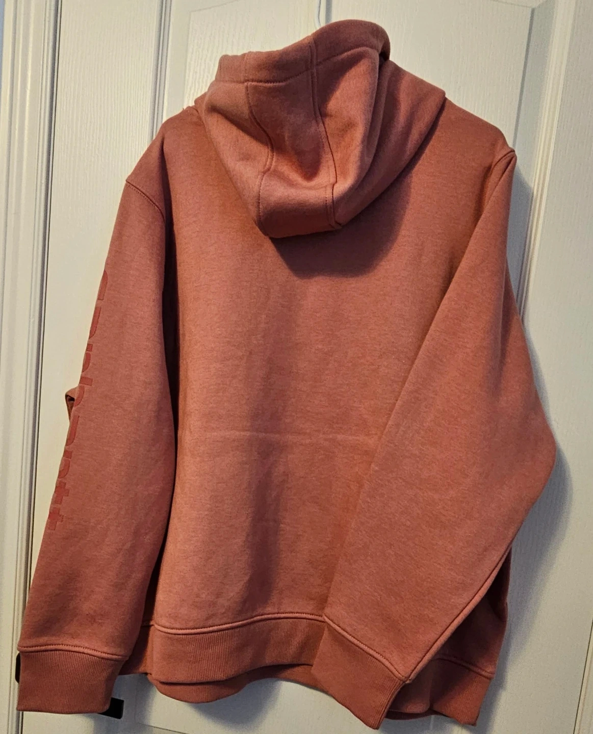 Carhartt hooded sweatshirt in a size 2X(20-22). Relaxed fit construction. Features a kangaroo pocket and Carhartt logo on left sleeve & front