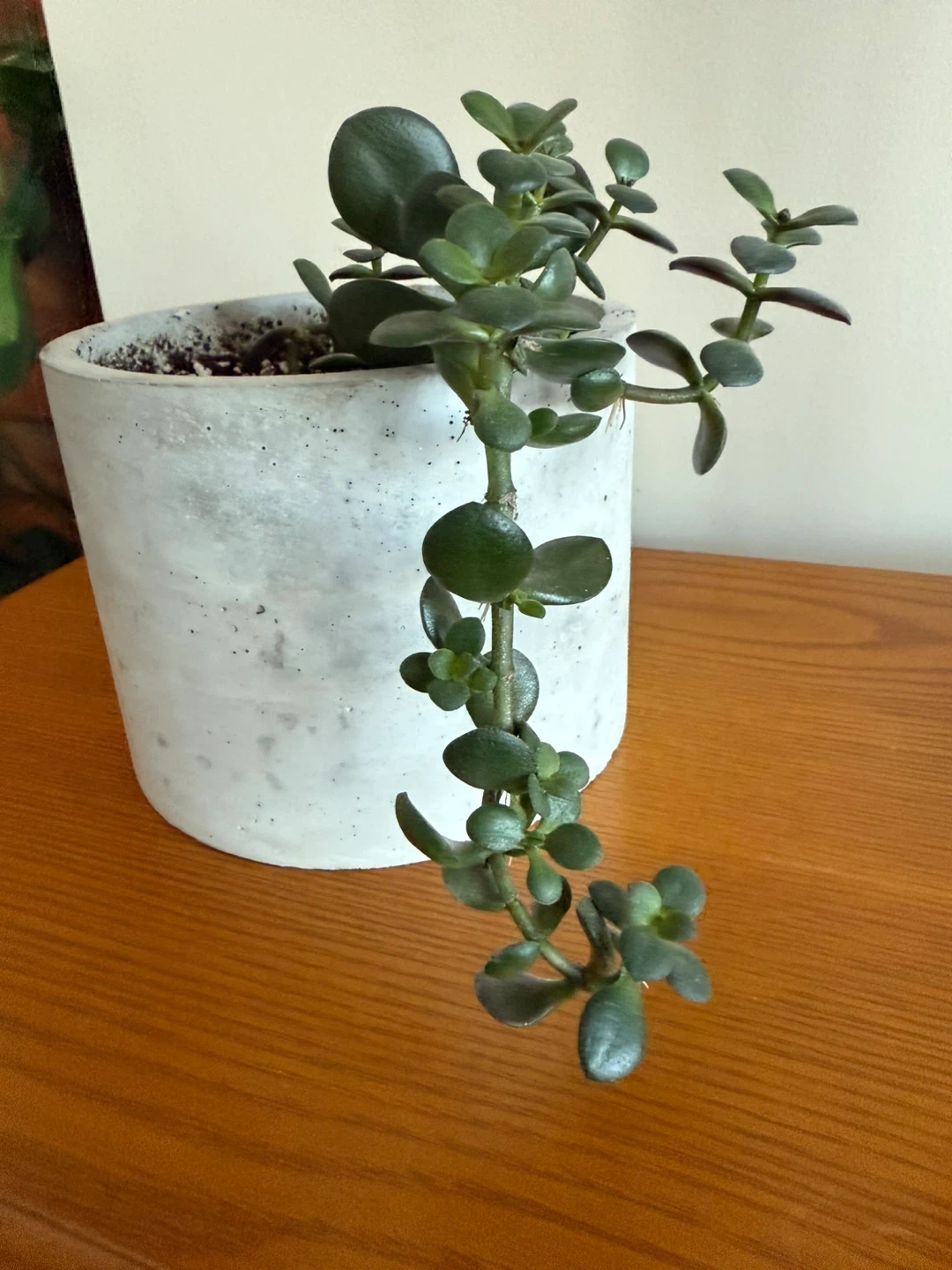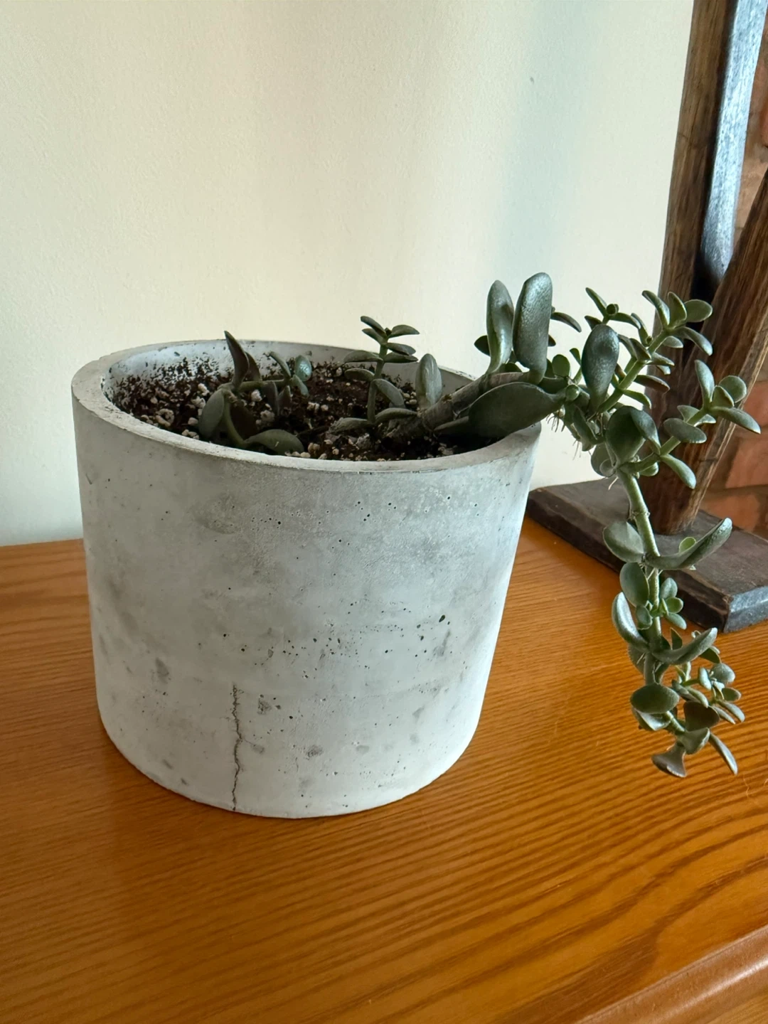 A jade plant is potted in a grey concrete planter. It's a low-maintenance succulent.