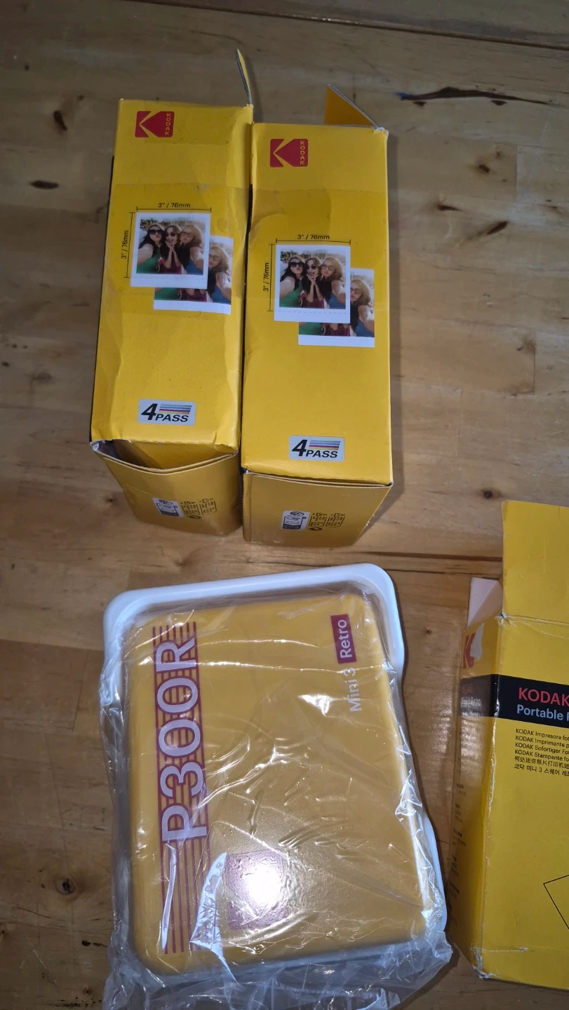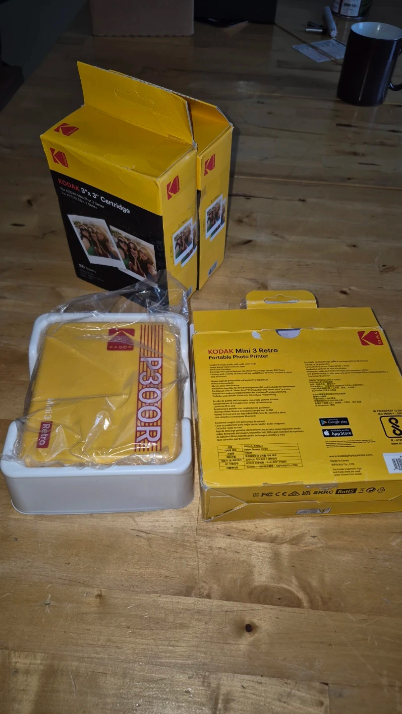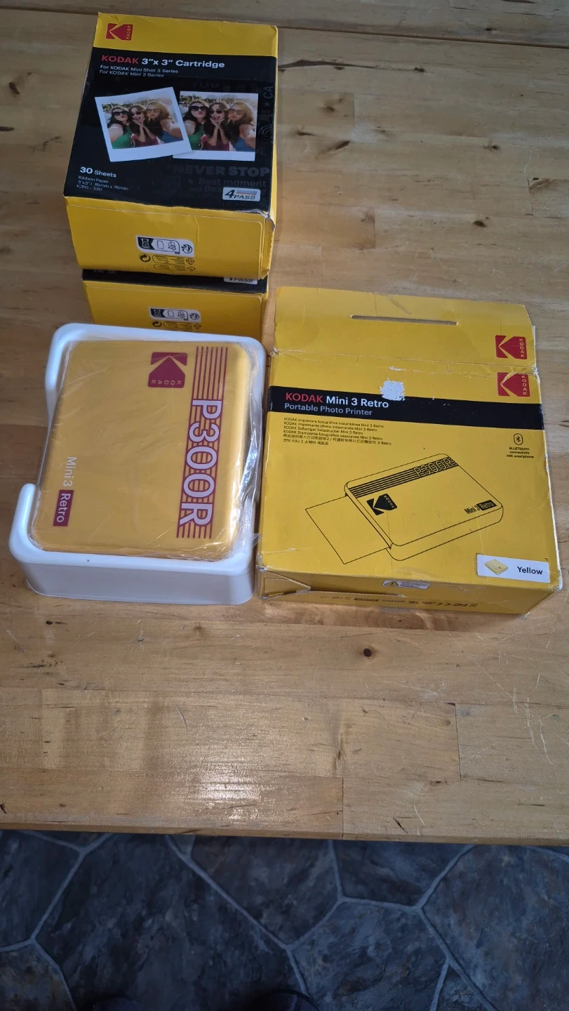 KODAK Mini 3 Retro NEW, Bluetooth, portable photo printer. Comes with one initial cartridge and 68 sheets of photo paper. Prints 3x3 inch photos.