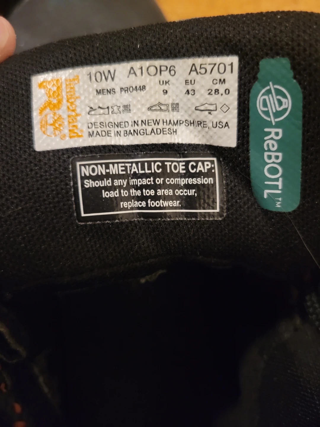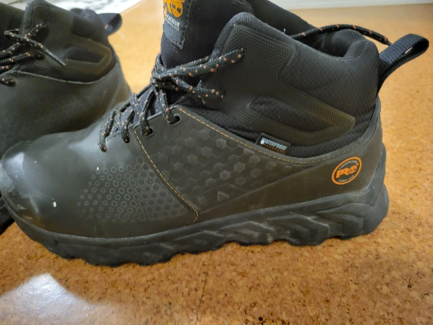 Selling a pair of Timberland PRO boots in size 10W. They feature anti-fatigue technology and a non-metallic toe cap for added protection. The boots were lightly used for 2 weeks while supervising a work project.