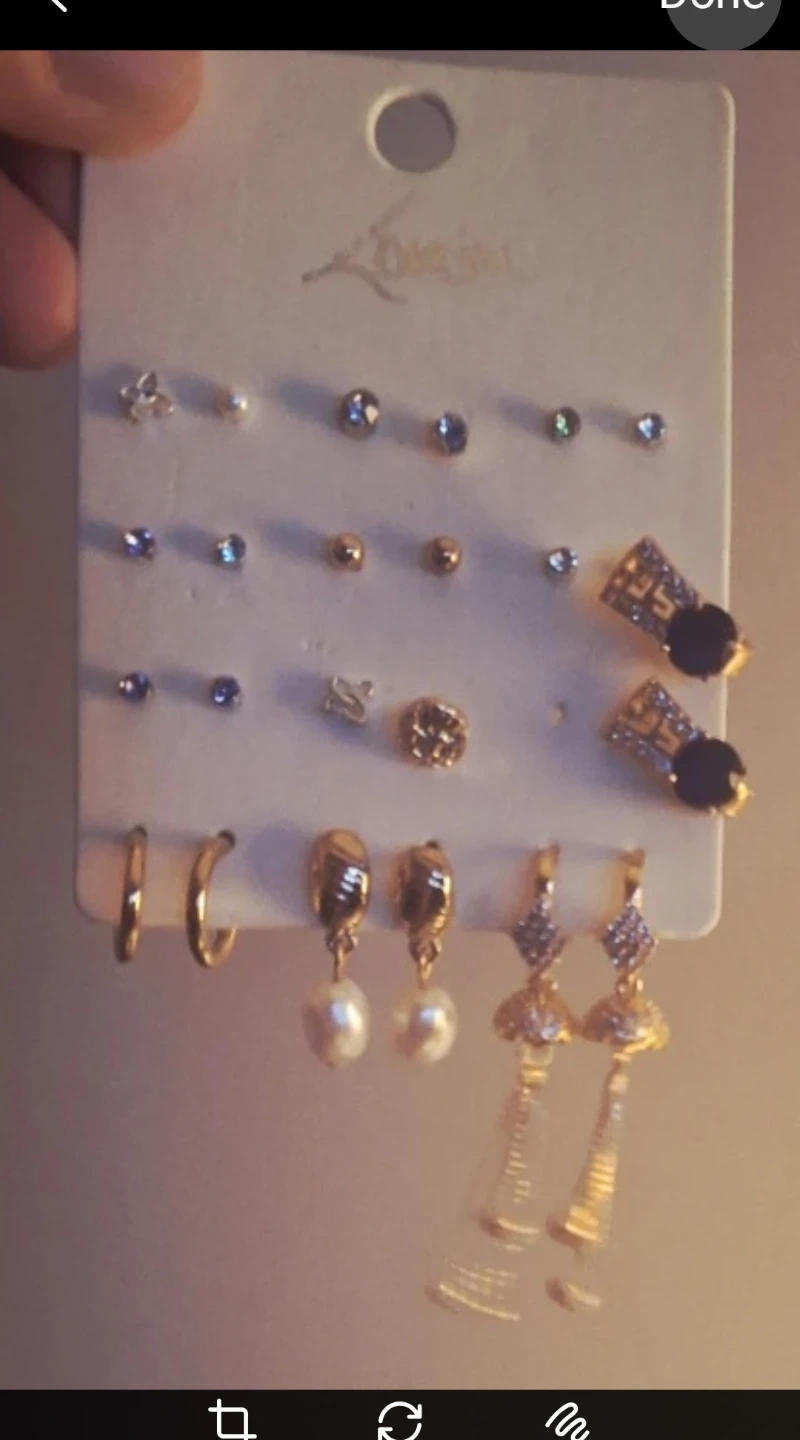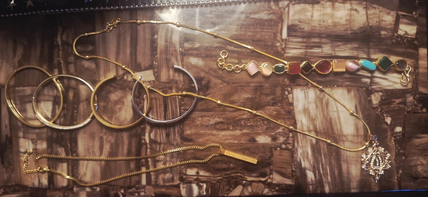 Includes a gold-tone necklace with colourful gemstone accents, a matching bracelet, three gold-tone bangles, and a silver-tone bangle. Also includes a set of assorted earrings featuring studs, hoops, and drop styles with pearls and cubic zirconia. A second necklace with a bar pendant is also included.
