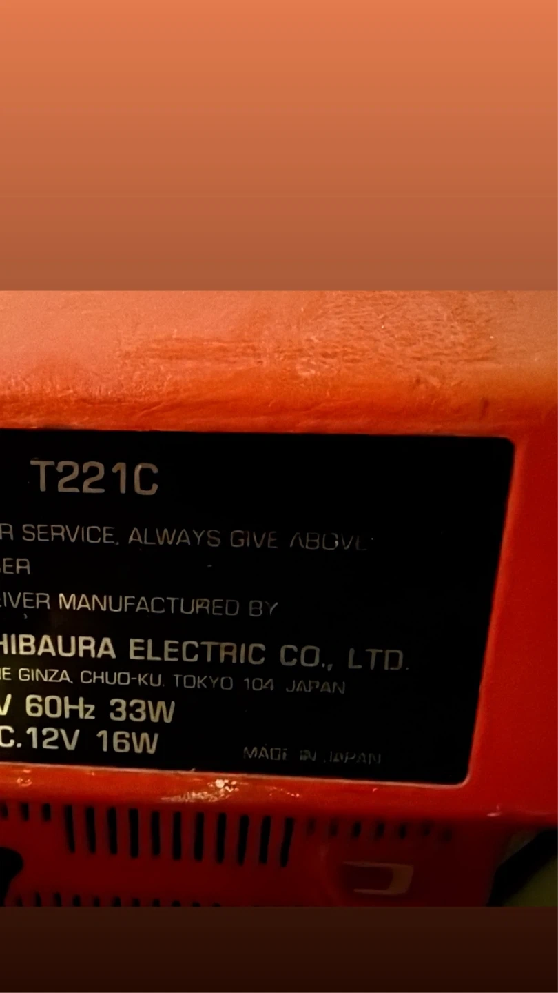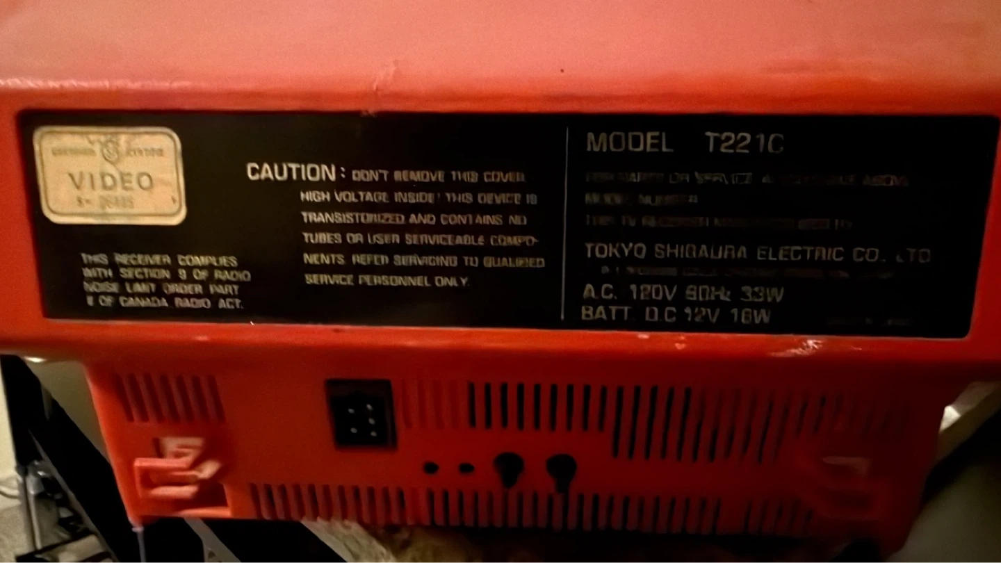 Toshiba solid state portable CRT television. It features VHF and UHF tuning dials, along with contrast and pull-on volume controls. This unit is red and black. Lost power cord so the price has been reduced.