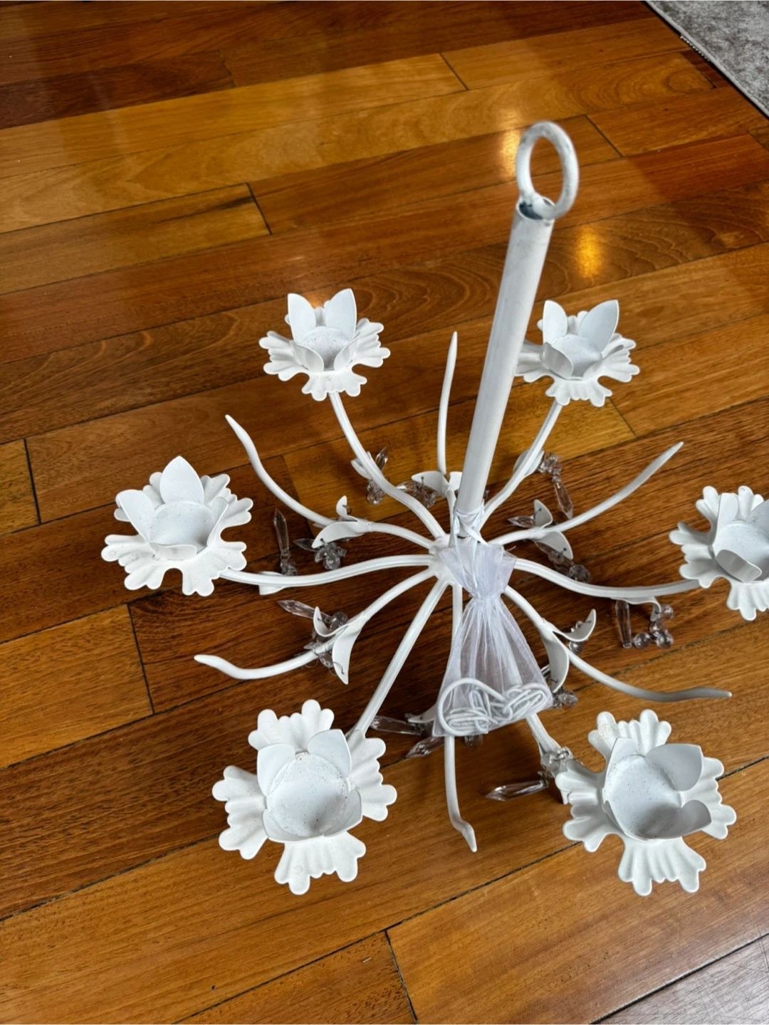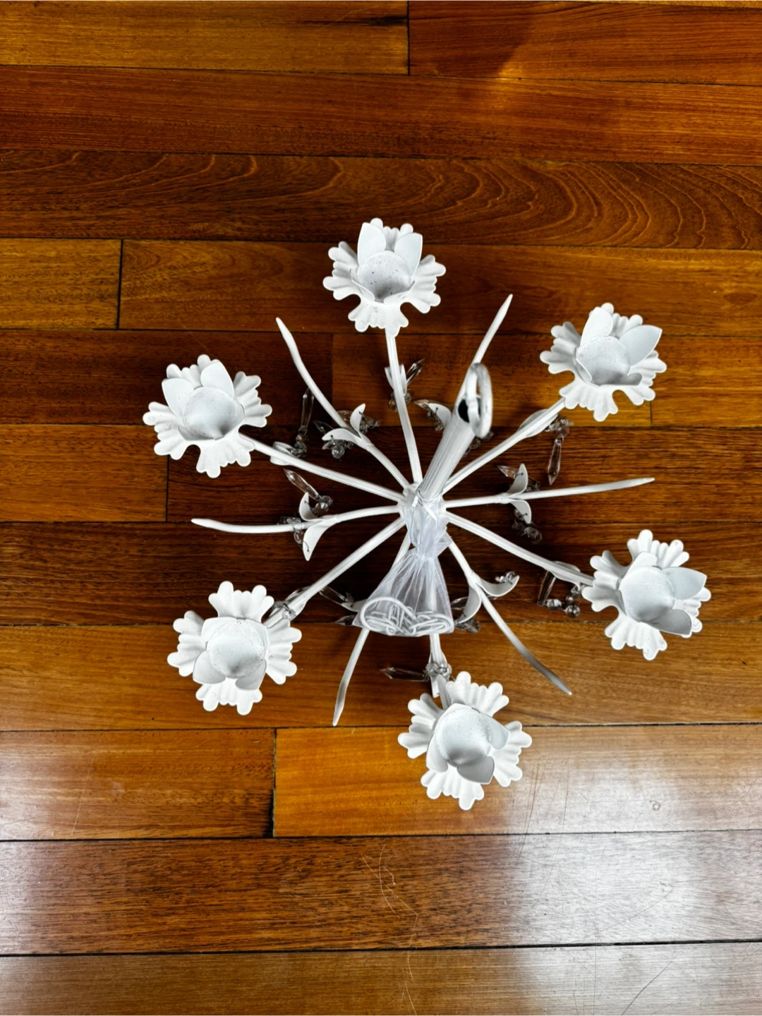 This white chandelier features decorative flower accents and dangling crystals. It has a metal construction and a central support pole with an attachment ring. Use as is, add candles or small plants to each flower holder.
