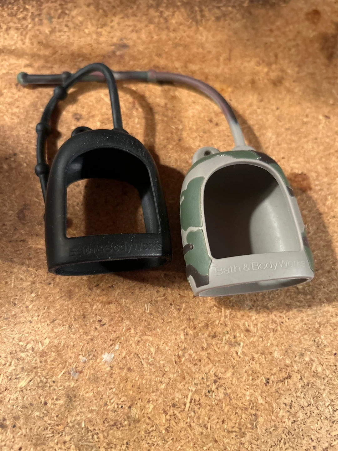 Selling two Bath & Body Works hand sanitizer holders! One is black and the other is a grey camo print. Perfect for keeping your sanitizer handy on your bag or keys