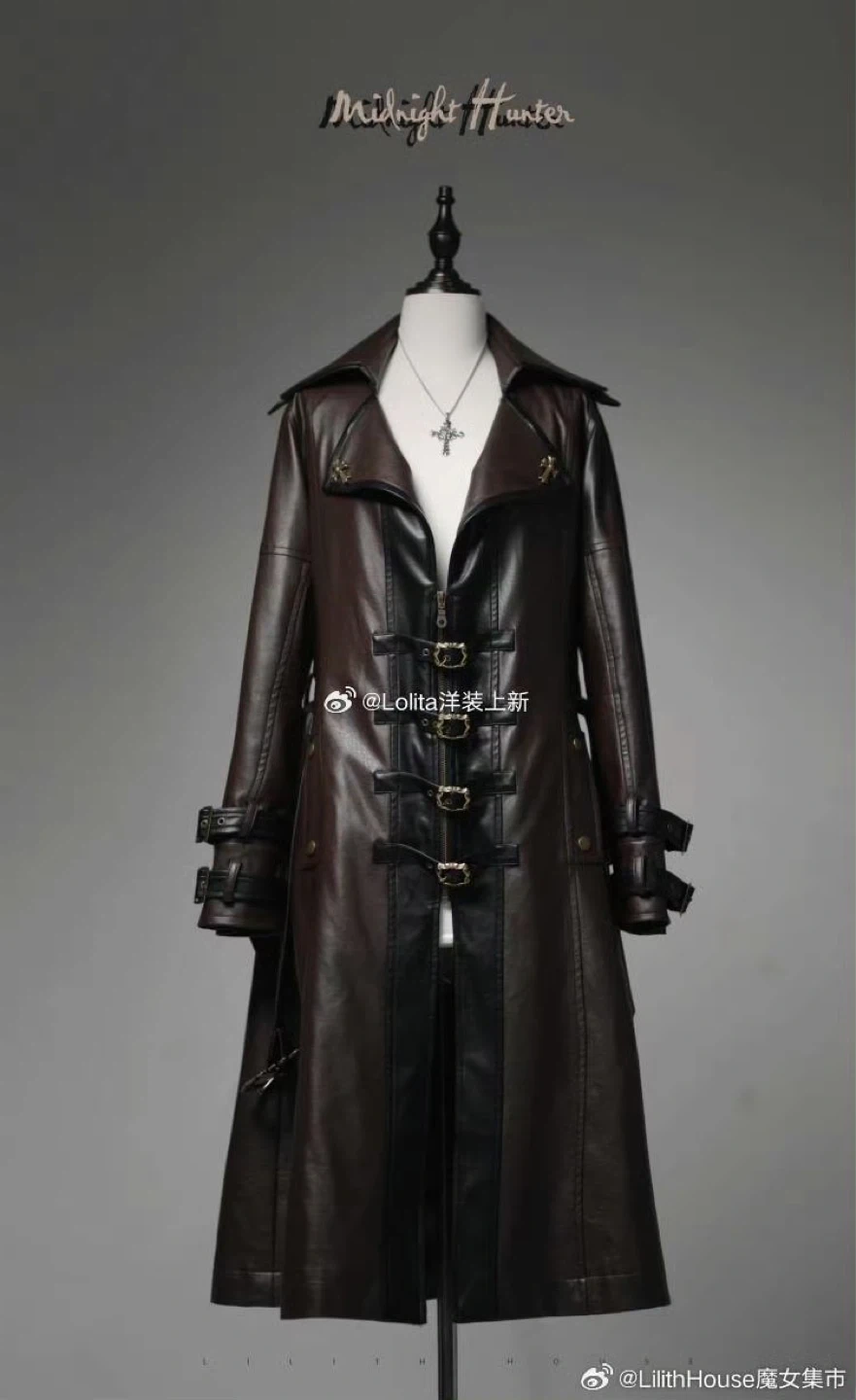 Brown and black faux leather trench coat with decorative buckles and ornate metal zipper accents. It has a satin-like black lining and a belted waist. Includes decorative cross details on the lapels. Perfect for matching lolita dress or Pirate style clothes. Brand new.