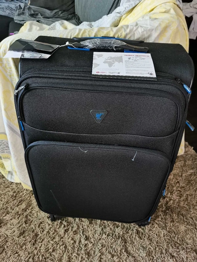 This brand new black luggage is perfect for your next trip! It's durable, stylish, and ready to go. size in the pictures side lock This luggage has never been used and is in supreme condition. It has lots of room for everything you need. If you're reading this, it's still available! PU ranchlands NW