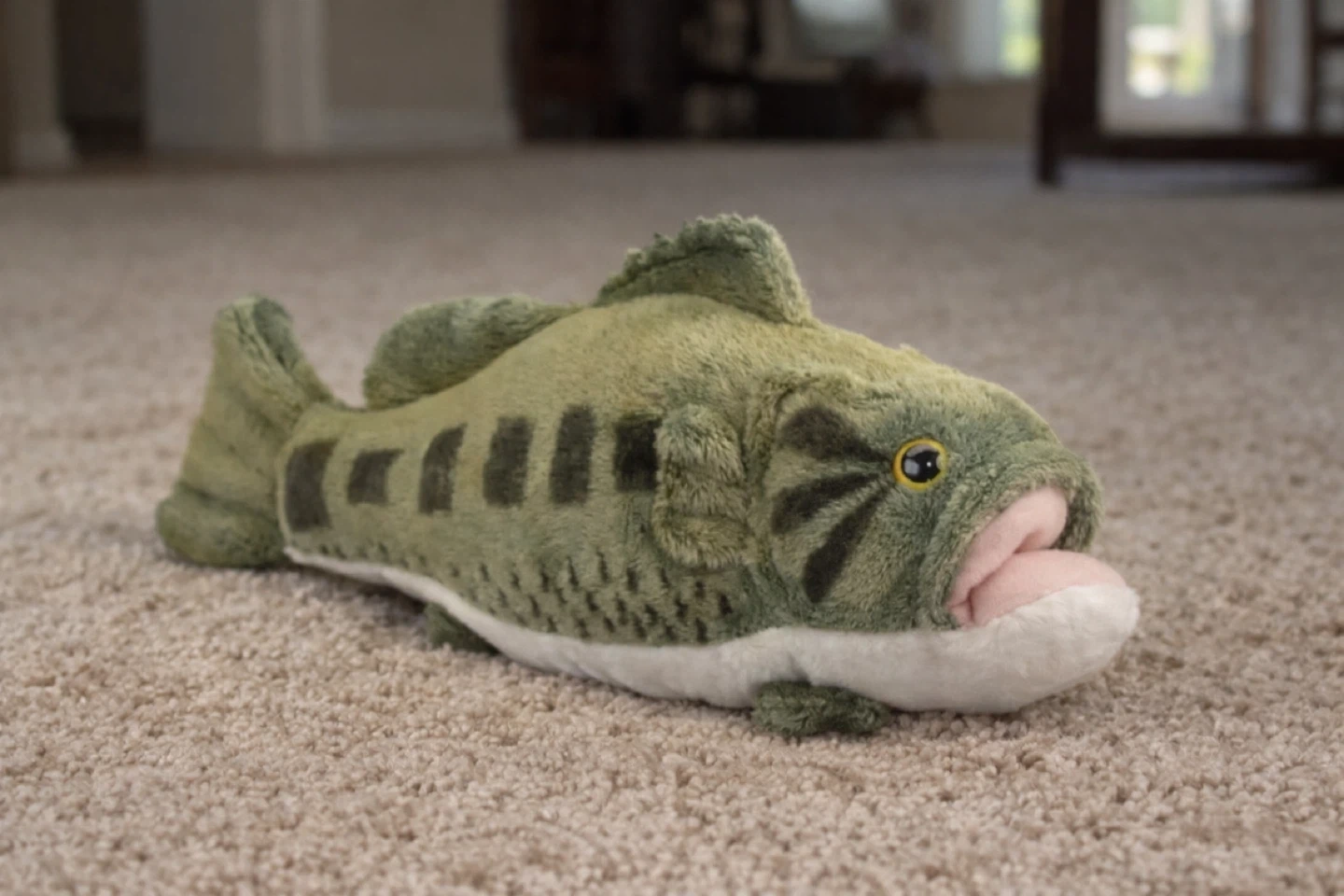 This is a soft, plush toy shaped like a green bass fish. It has realistic markings and a pink interior mouth. It's made of fuzzy material. This toy is great for kids or as a fun decoration!