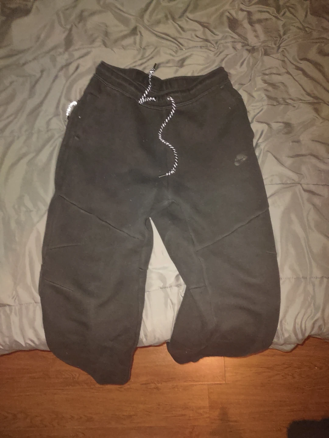 Black Nike Tech Fleece joggers with a drawstring waist. Features the signature paneling and a small embroidered Nike swoosh. Made from a comfortable fleece material.