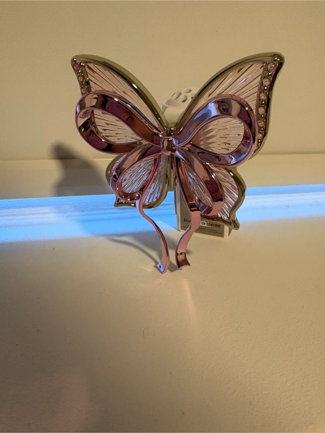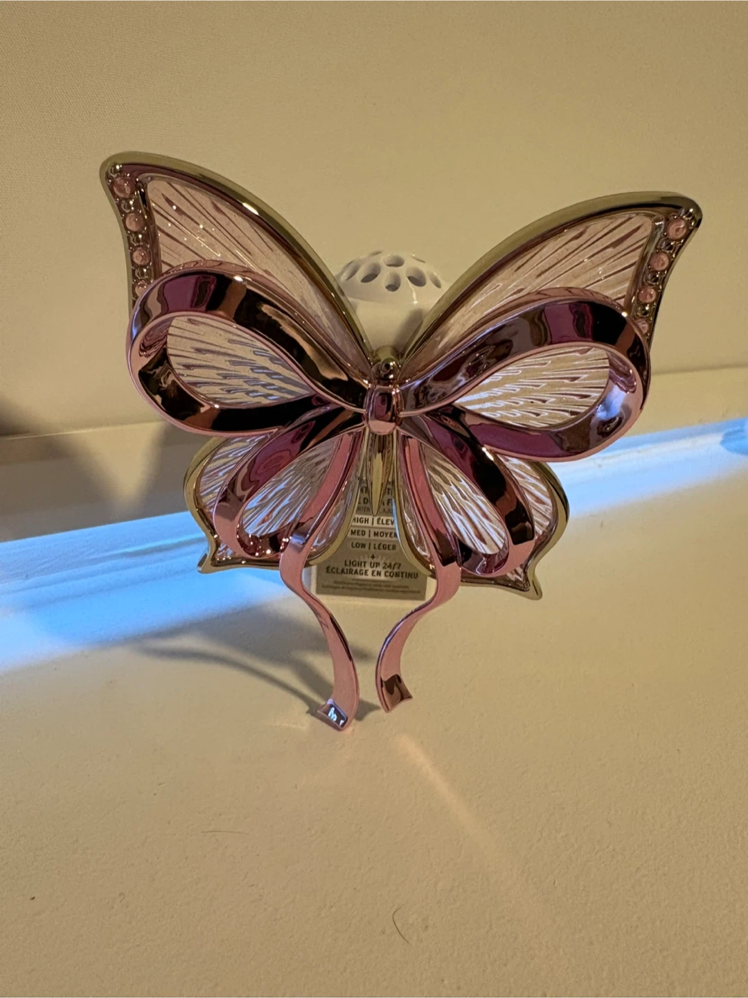 This is a Bath & Body Works Wallflower plug with a decorative butterfly design. It has adjustable settings for fragrance intensity. Plug it in to enjoy continuous scent in any room!