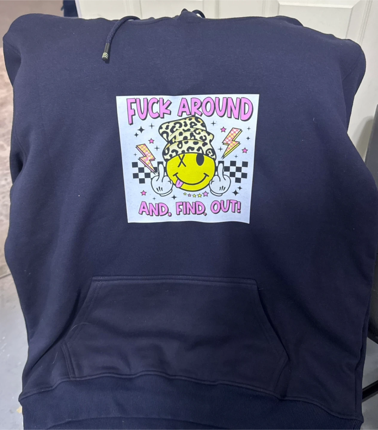 This navy blue hoodie features a bold graphic with a smiley face, leopard print hat, and the phrase "Fuck Around and Find Out!". It's a comfortable pullover with a front pouch pocket. A great way to show off some attitude! Hoodies $35.00, we can put whatever you want on yours.