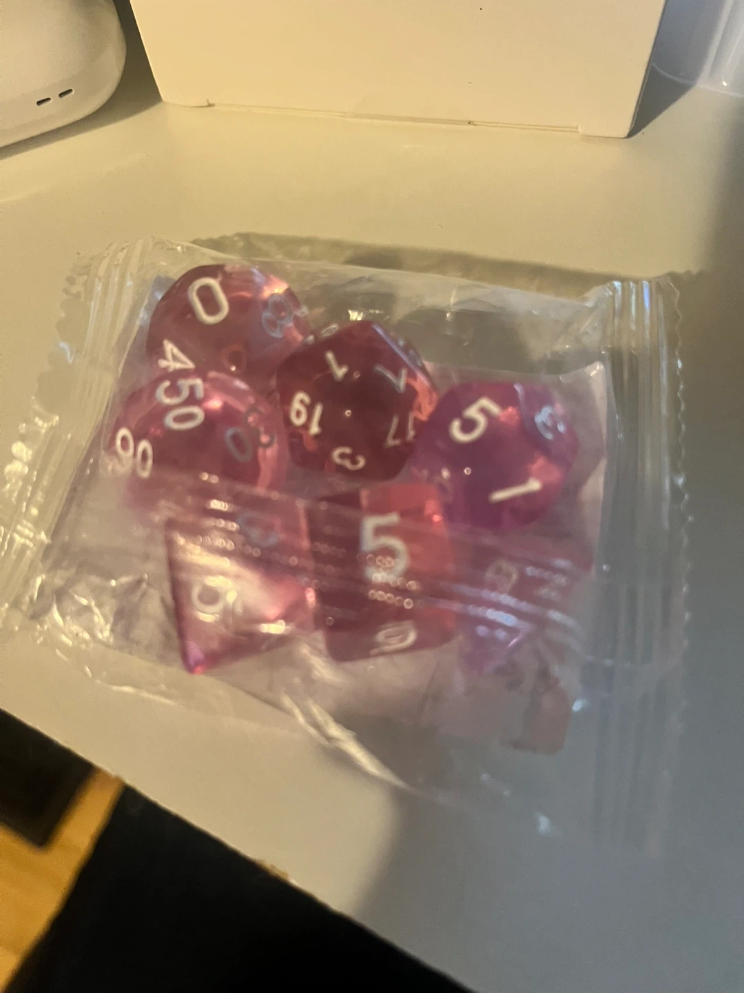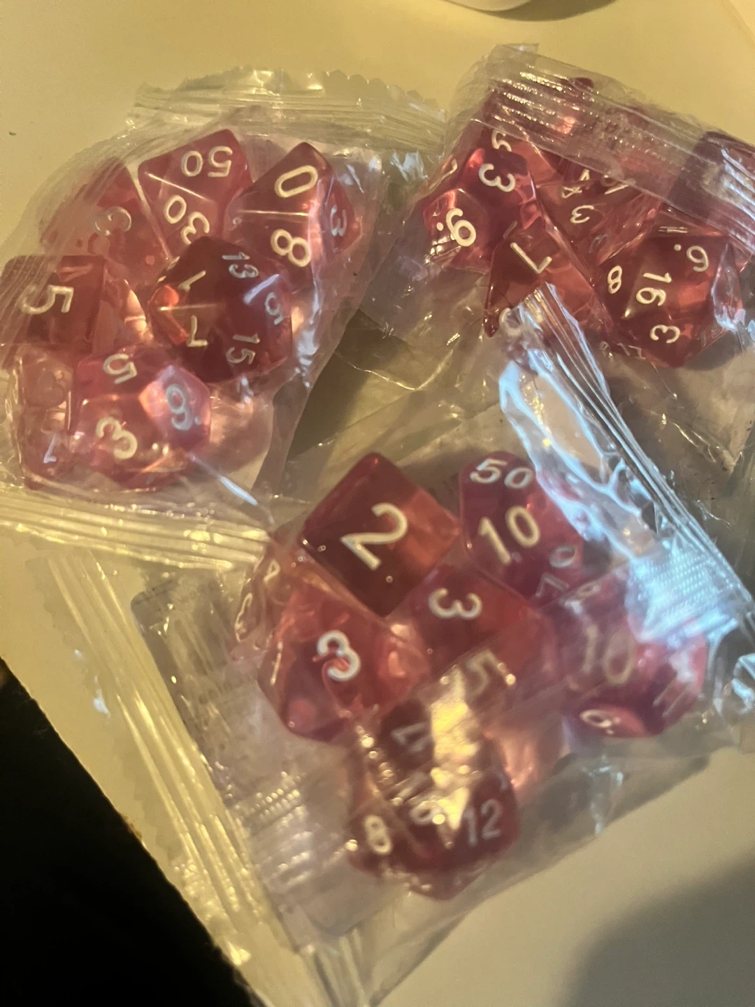 10Selling 3 brand new sets of 7 transparent powder dice. These dice are perfect for tabletop games like Dungeons and Dragons or Pathfinder. They come in their original packaging and are ready for your next adventure!