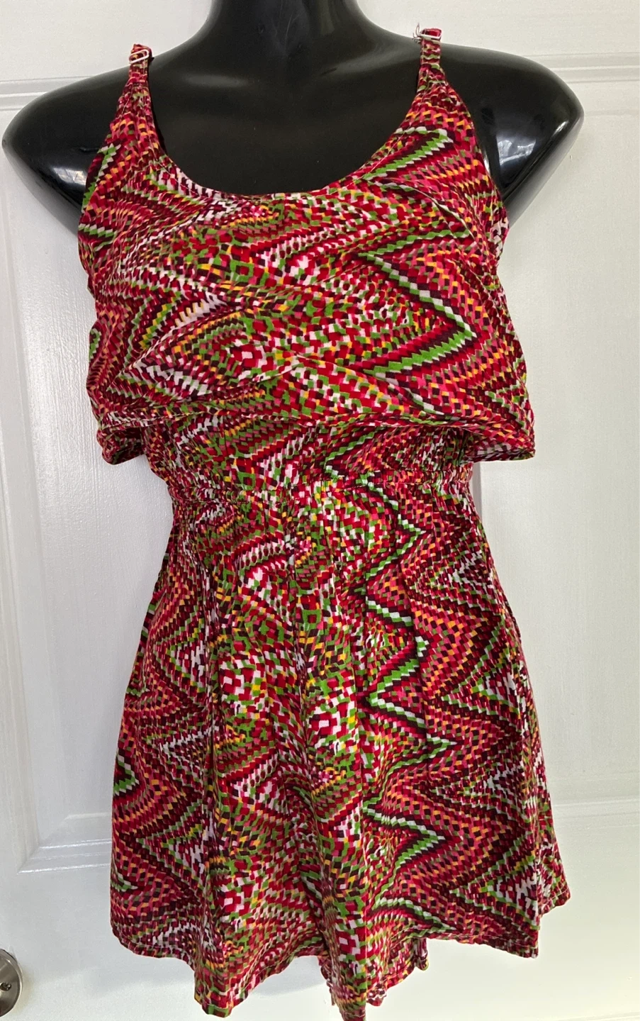 This women's romper features a vibrant abstract print. It has adjustable straps and a comfortable elastic waist. Made from a lightweight fabric, it's perfect for warm weather!