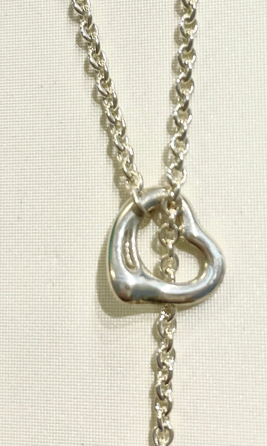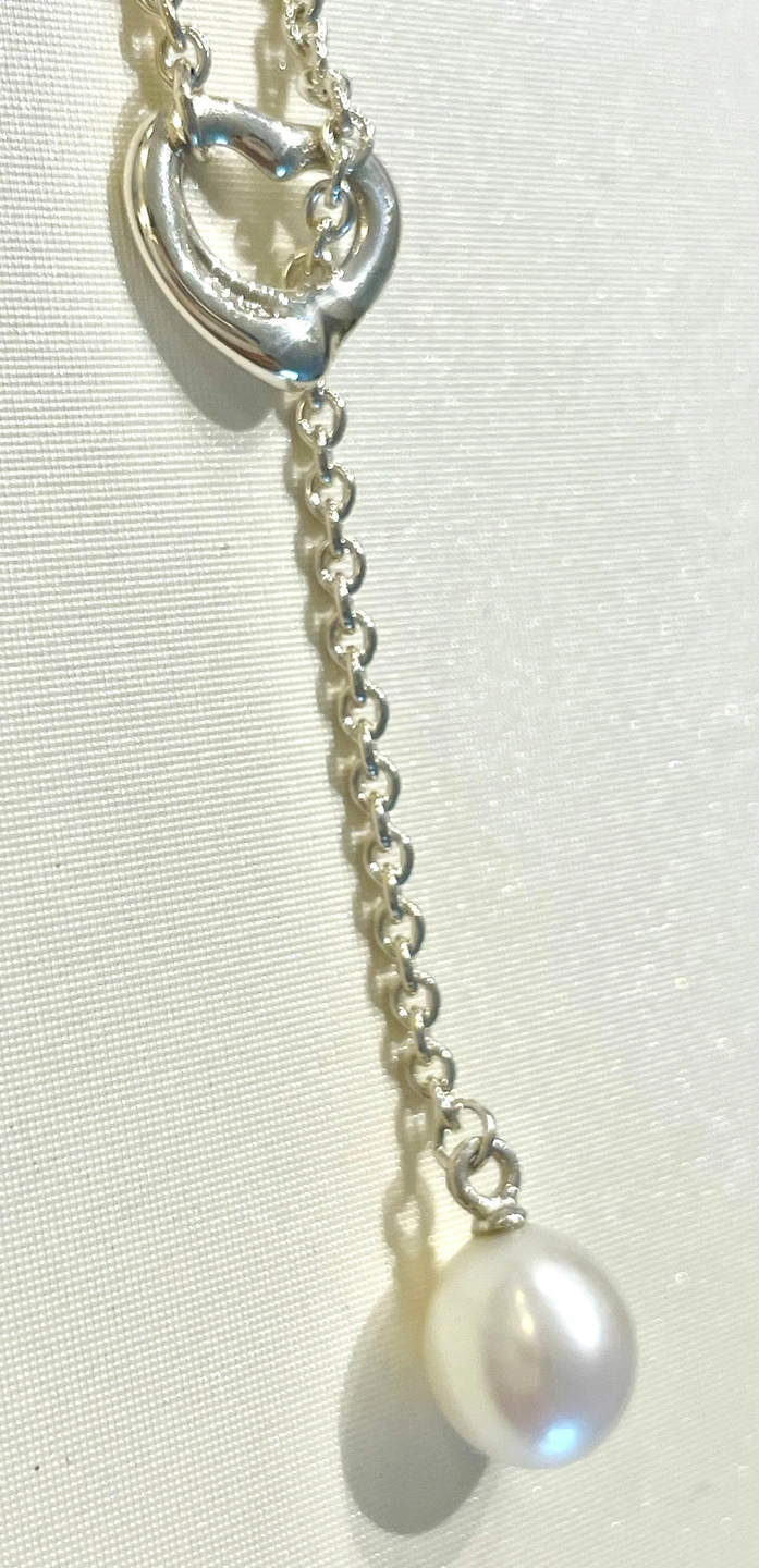 Authentic Tiffany & Co. necklace from the iconic Elsa Peretti Open Heart collection. This is a stunning lariat-style necklace in .925 sterling silver, featuring a 9–9.5 mm freshwater cultured pearl. The Open Heart design was first introduced in 1974 and remains one of Tiffany's most beloved and enduring collections.