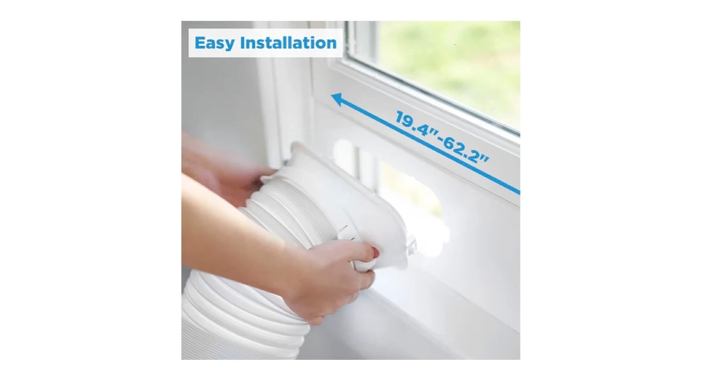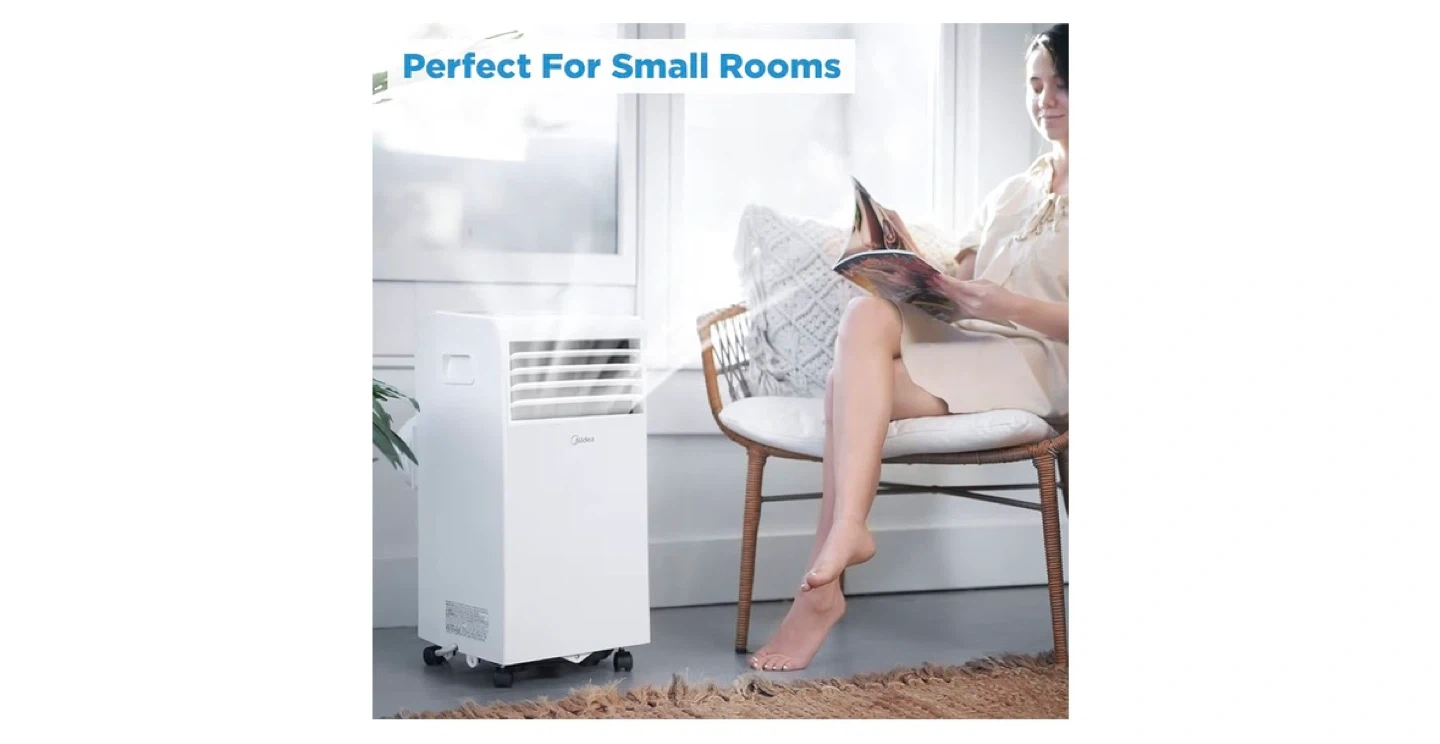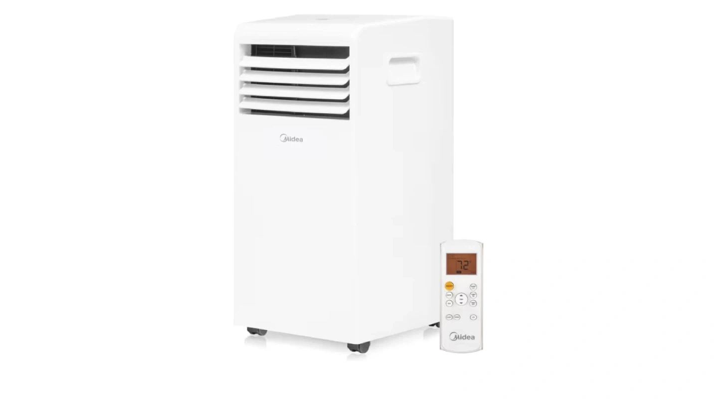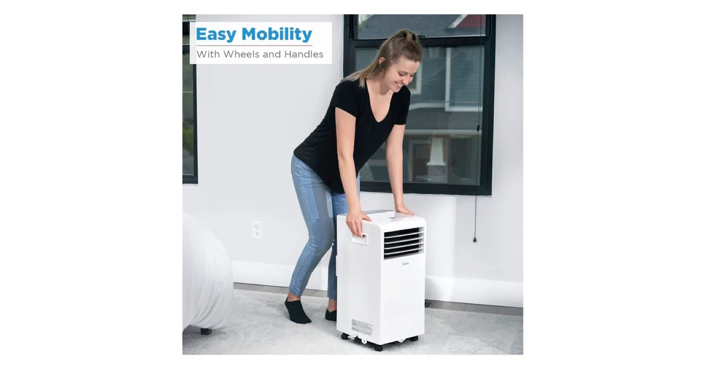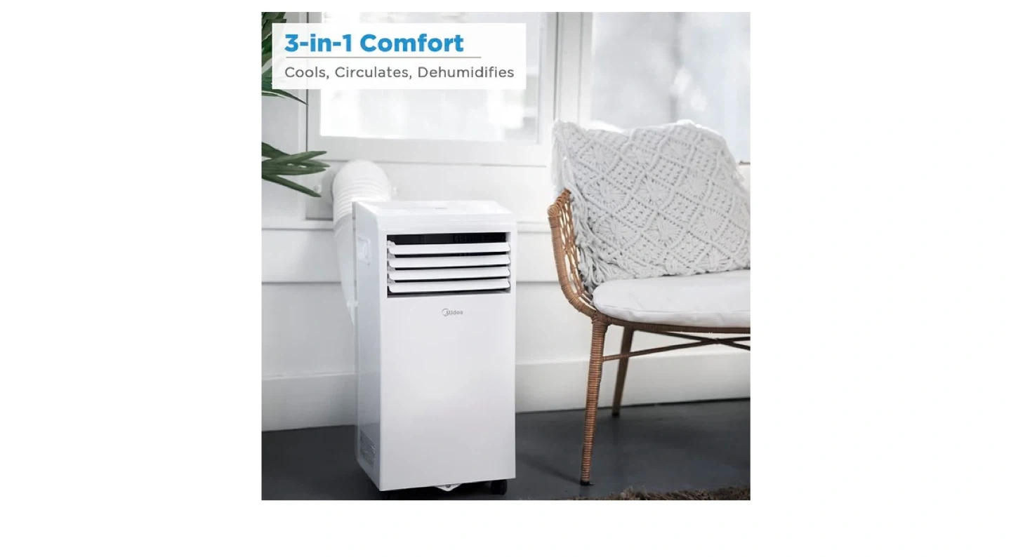This Midea 3-in-1 portable air conditioner cools, circulates, and dehumidifies rooms. It features easy mobility with wheels and handles for simple placement. Window kit fits openings from 19.4" to 62.2".