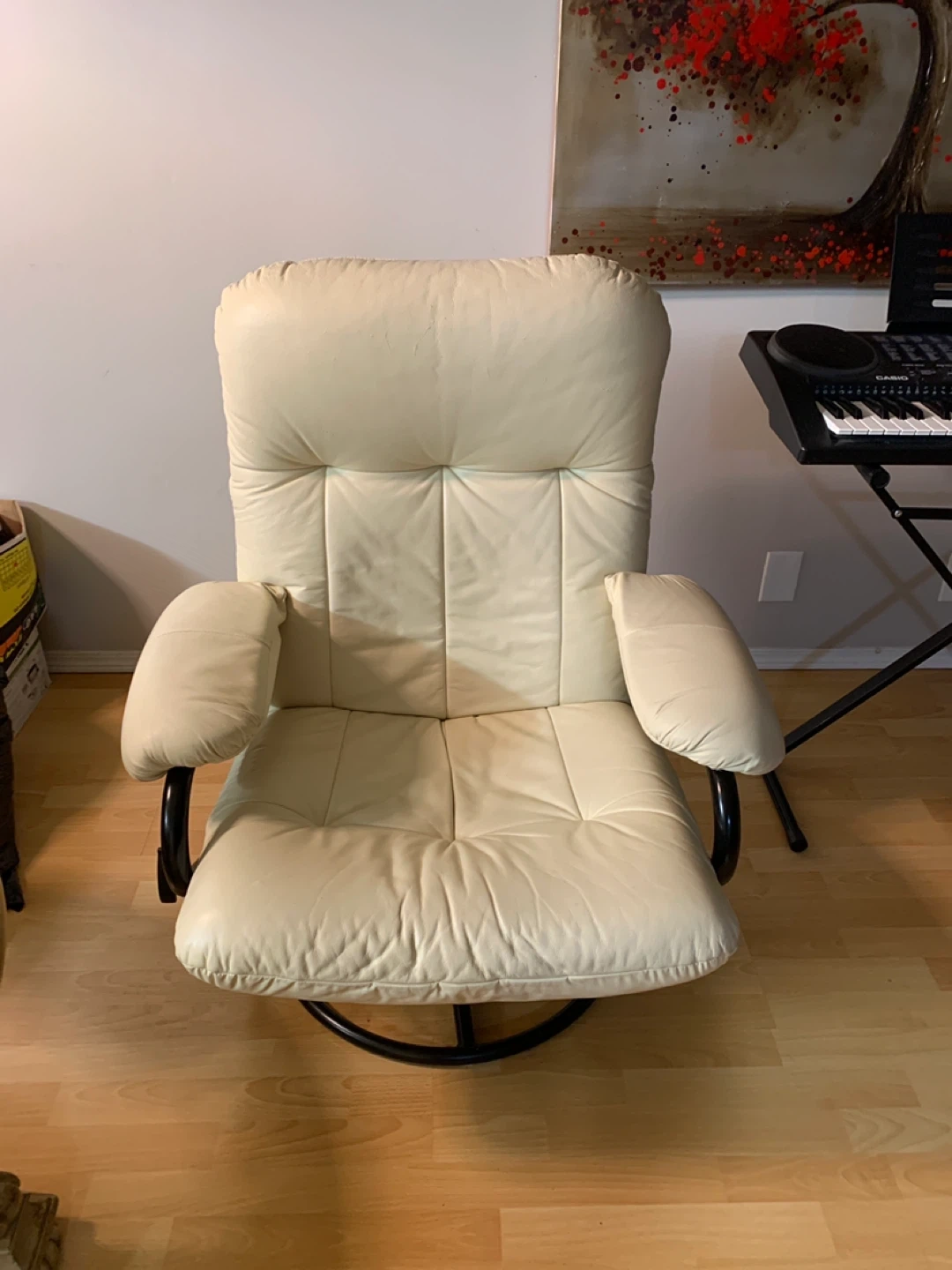 Comfortable cream leather recliner chair with a swivel base. It's tufted for extra comfort and has padded armrests. This chair is perfect for relaxing in your living room.