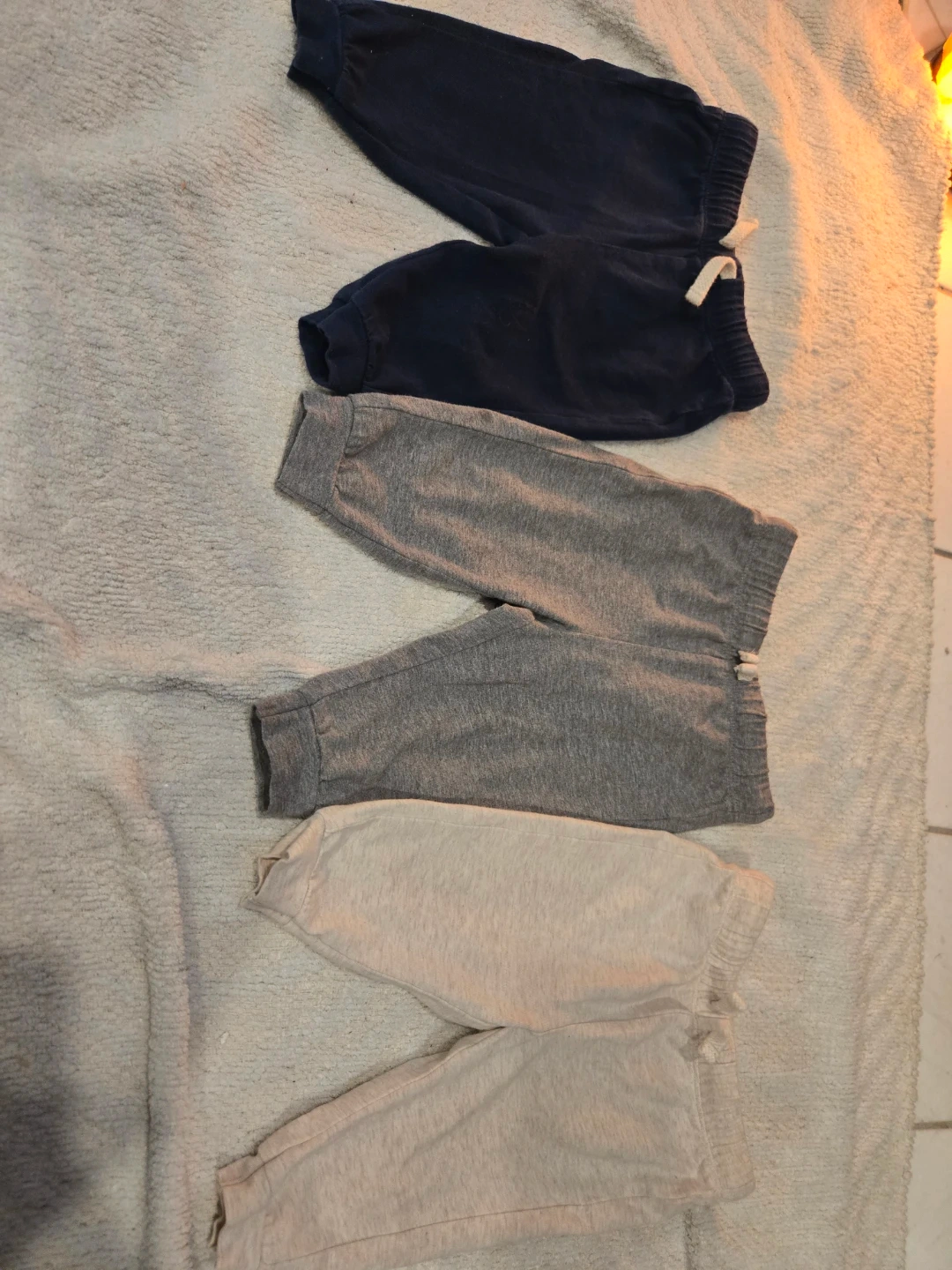 Includes navy blue, grey, and light beige colours. These pants are made from a soft, cotton material, perfect for everyday wear. Elastic waistband with drawstring for a snug fit. Gently used, unscented & smoke free pet free home. Carried my sweet girl through many comfortable days of stretching & tummy time✨️