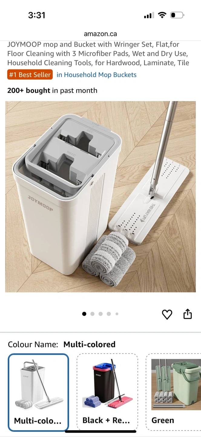 Includes bucket with built-in wash & dry system, flat mop, and microfiber pads. Works perfectly for hardwood, laminate, and tile floors. Easy to use and very convenient for small spaces.