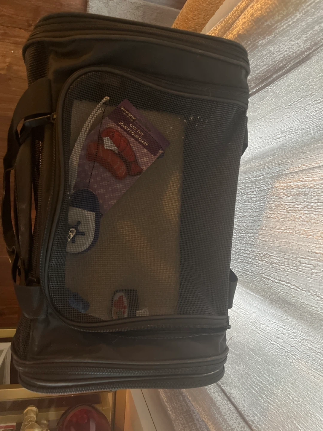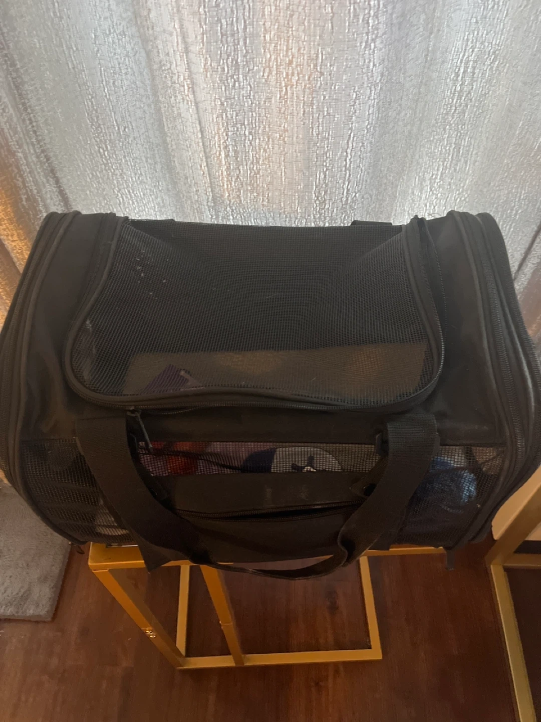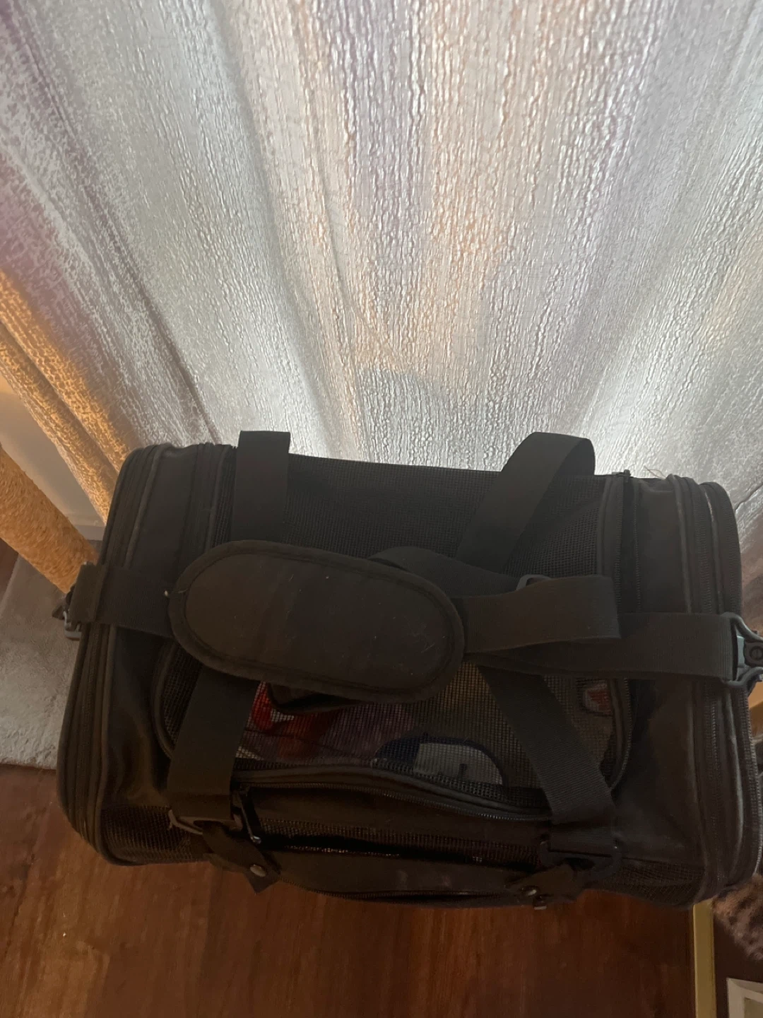This is a used black pet carrier bag with mesh ventilation. It's designed for safe and comfortable travel for your pet. Features multiple zippers and carrying handles.