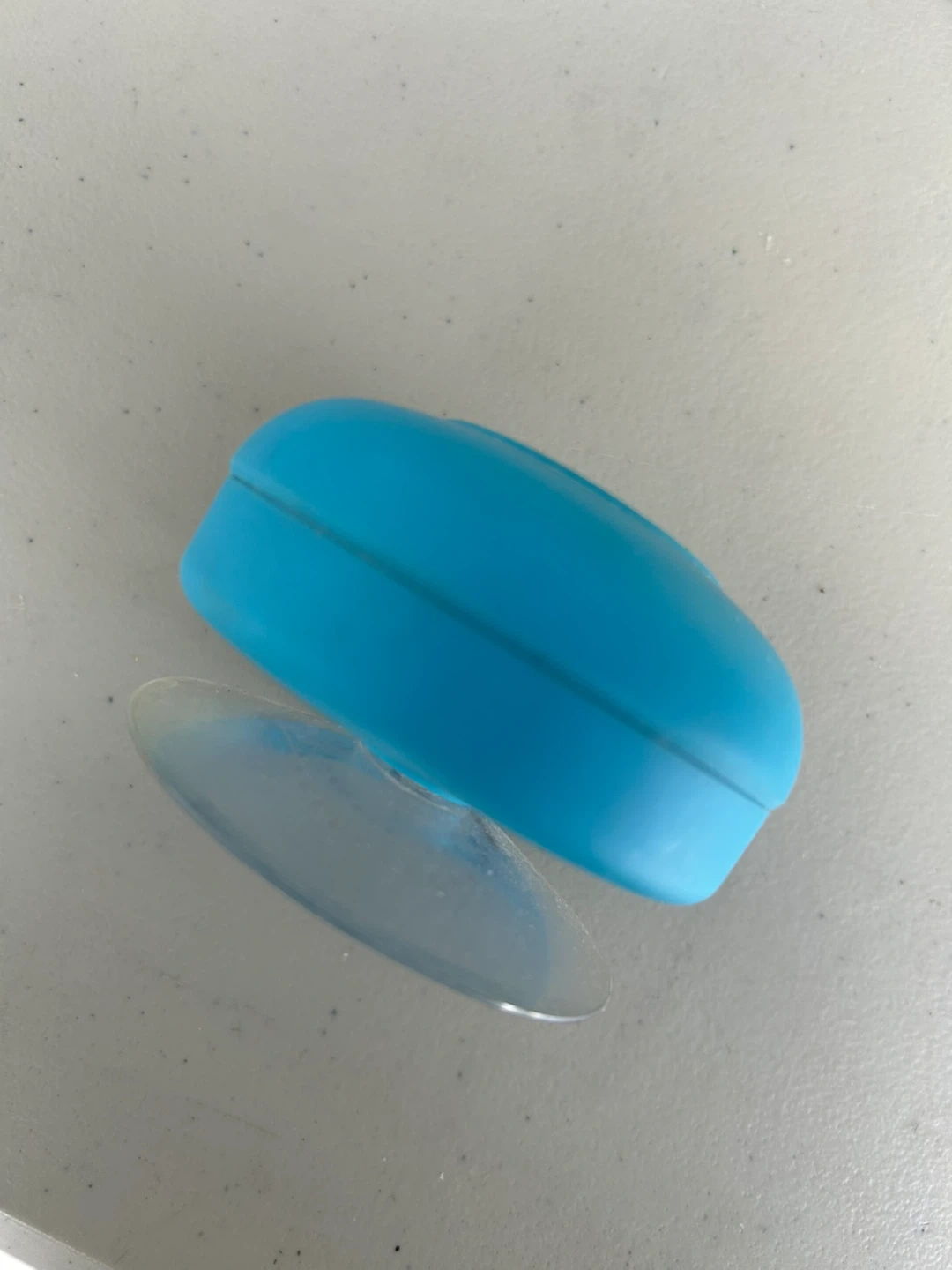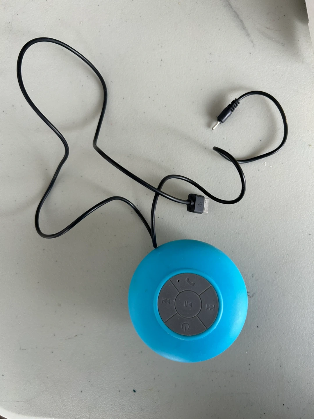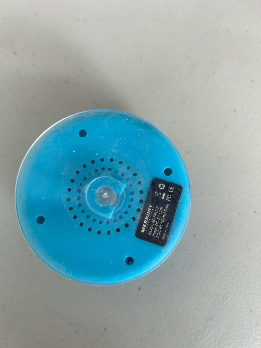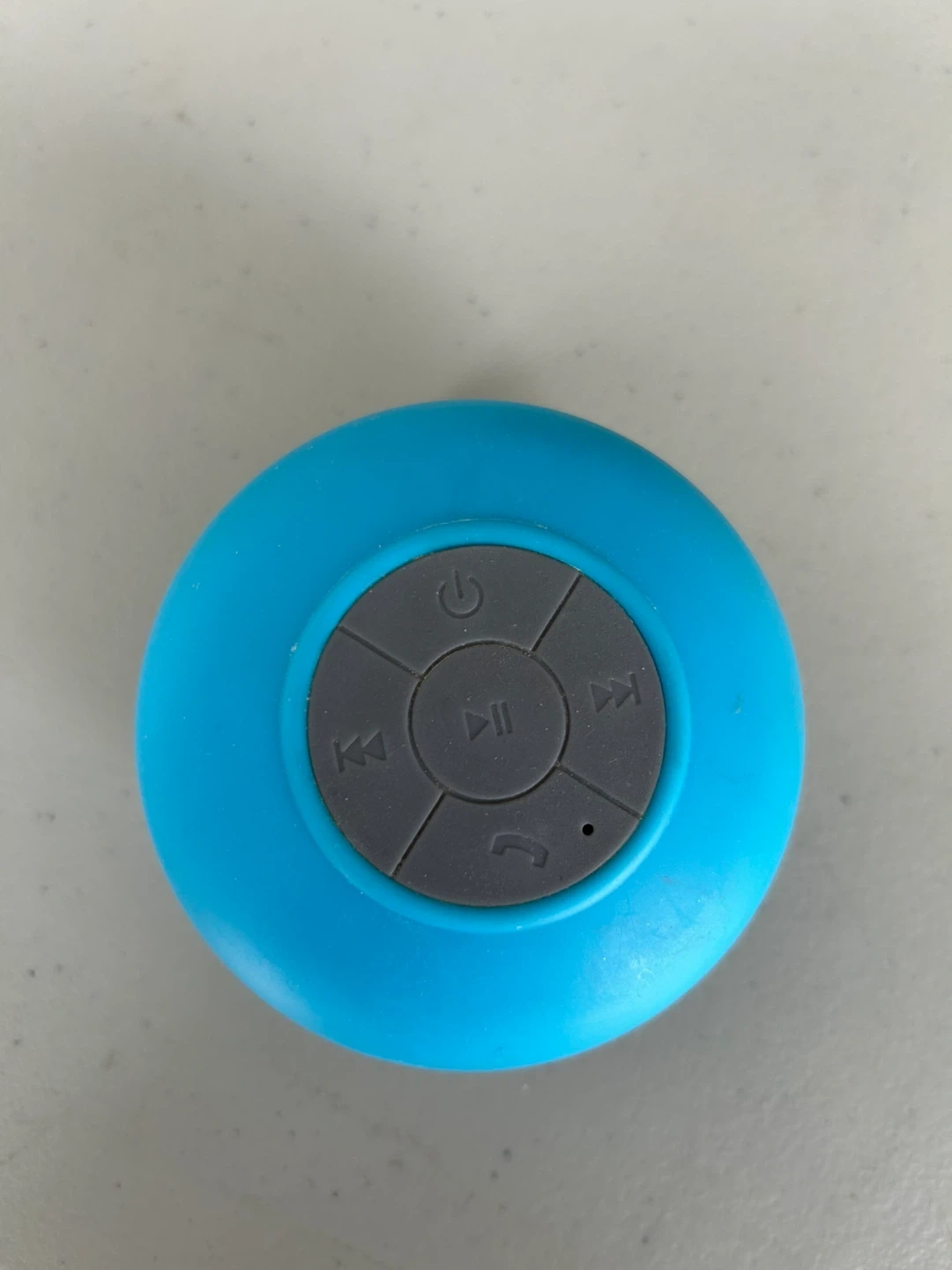 Compact blue Merkury MA-SPB12 Bluetooth speaker with suction cup. Includes USB charging cable. Water-resistant design makes it great for the shower!