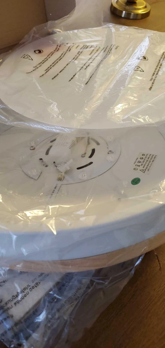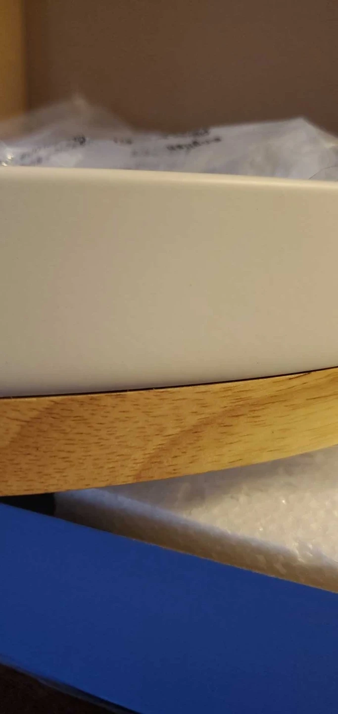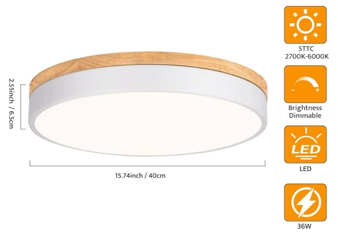 This modern flush mount ceiling light fixture features a natural wood accent and a white finish. It's LED, dimmable, and has a brightness of 2700K-6000K. The fixture is 15.74 inches in diameter and 2.55 inches in height. Open box