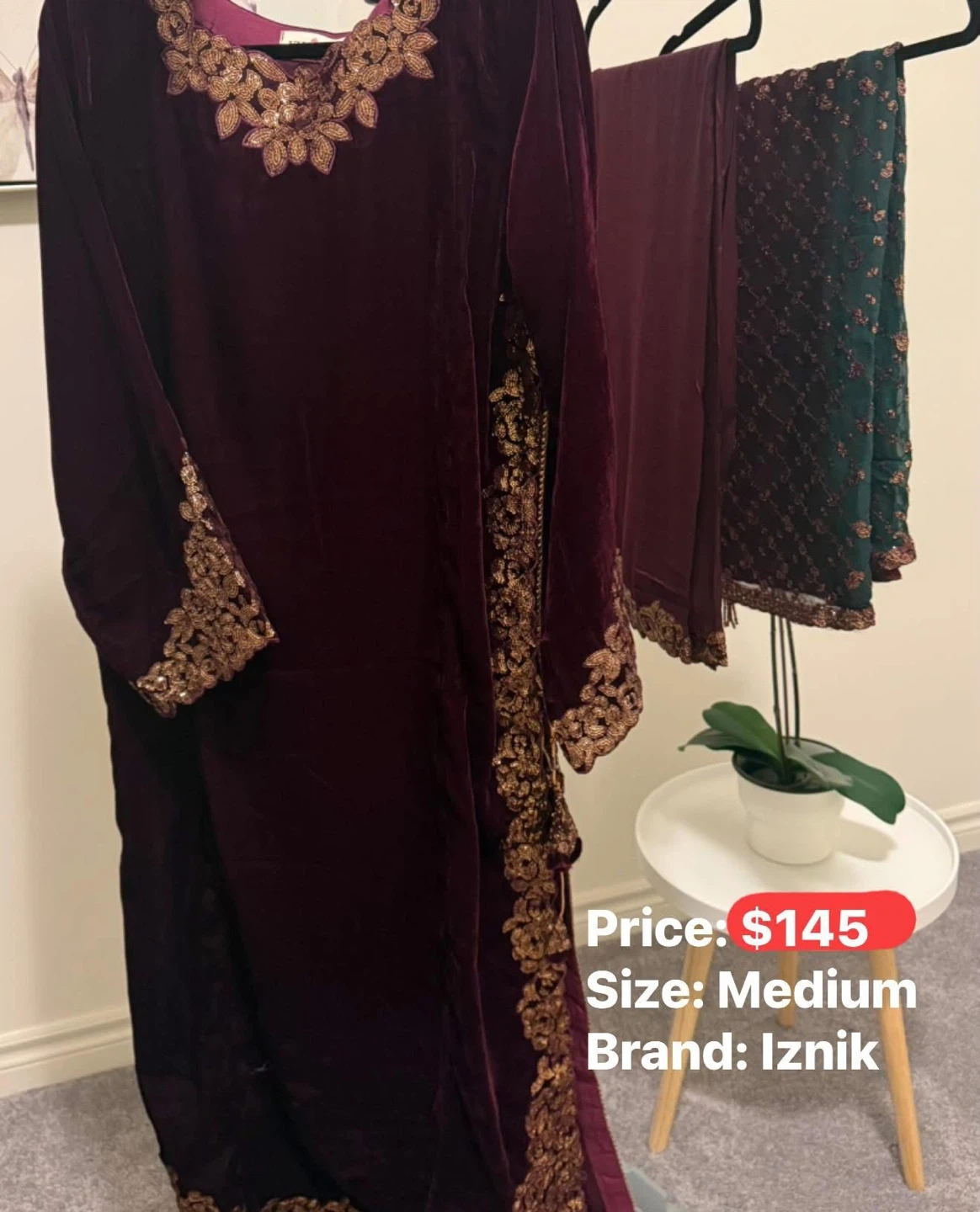 Beautiful Iznik velvet kurta set in a rich plum colour. It features intricate gold embroidery on the neckline and sleeves. Set includes kurta, matching pants, and a green dupatta with gold embellishments. Size medium.