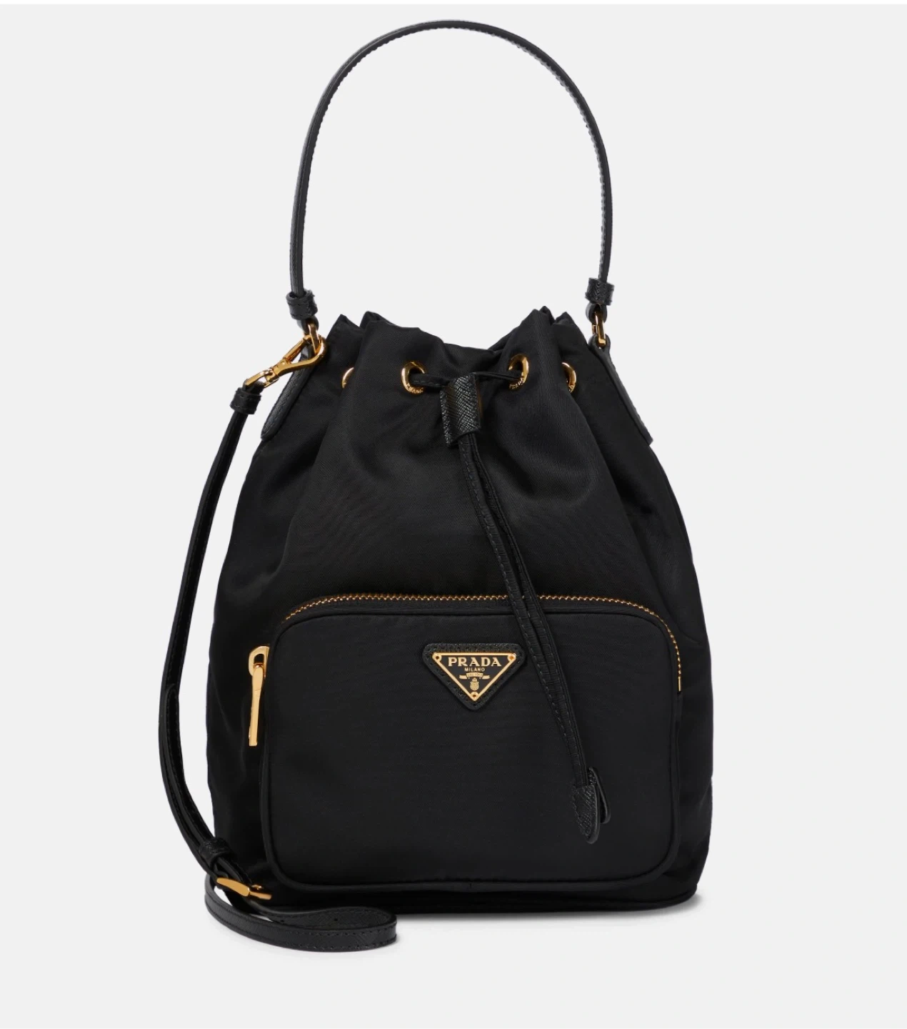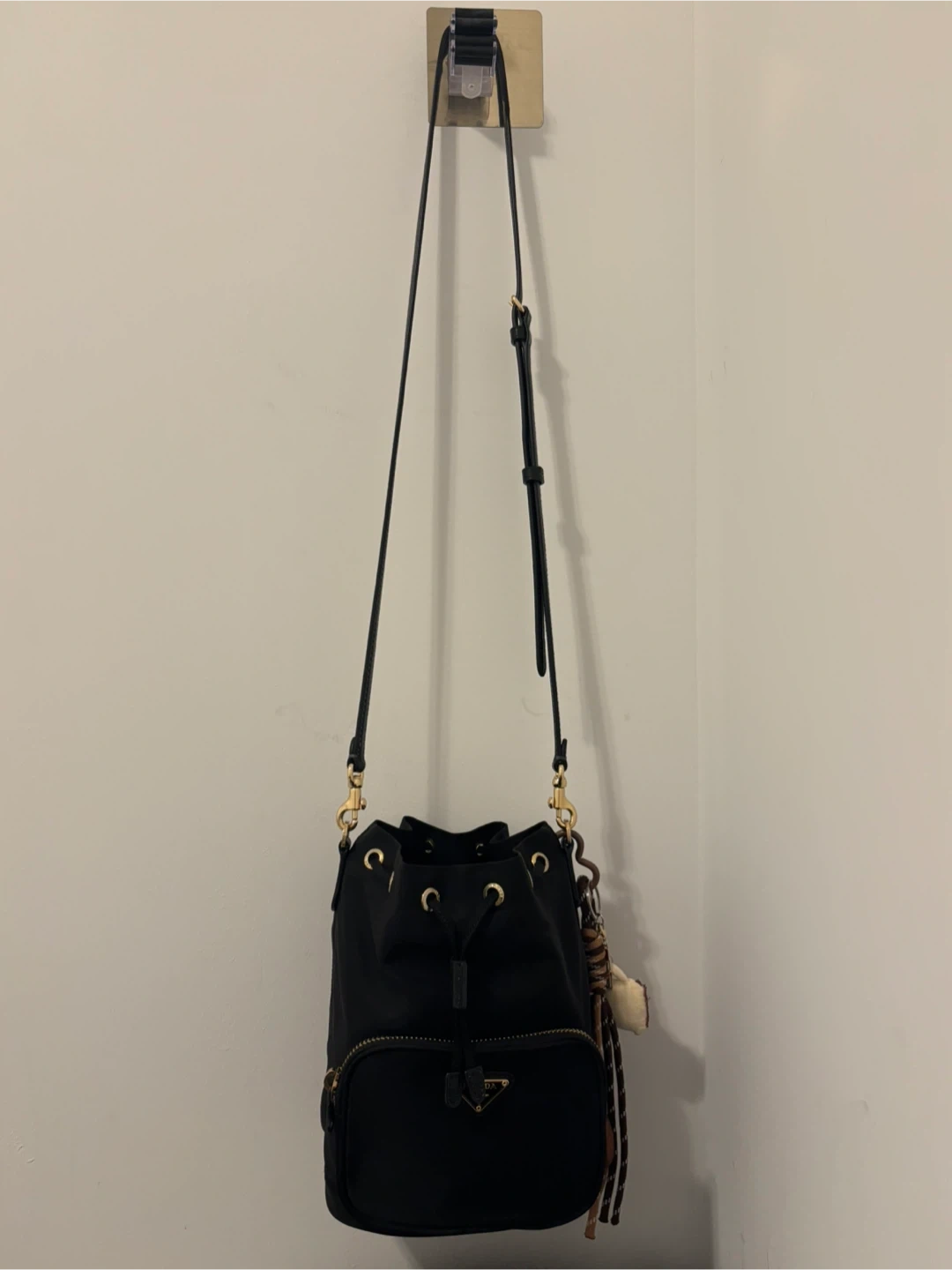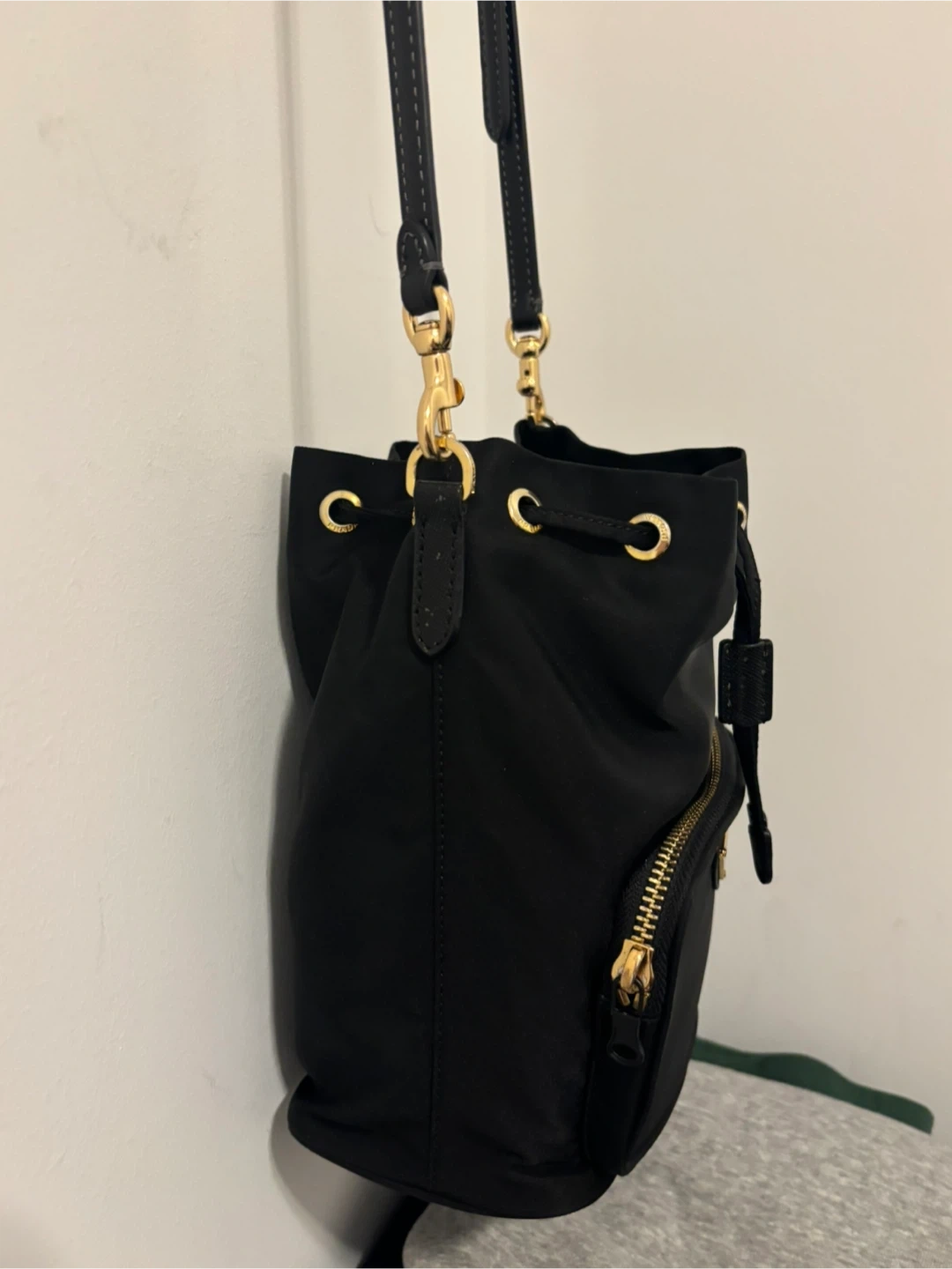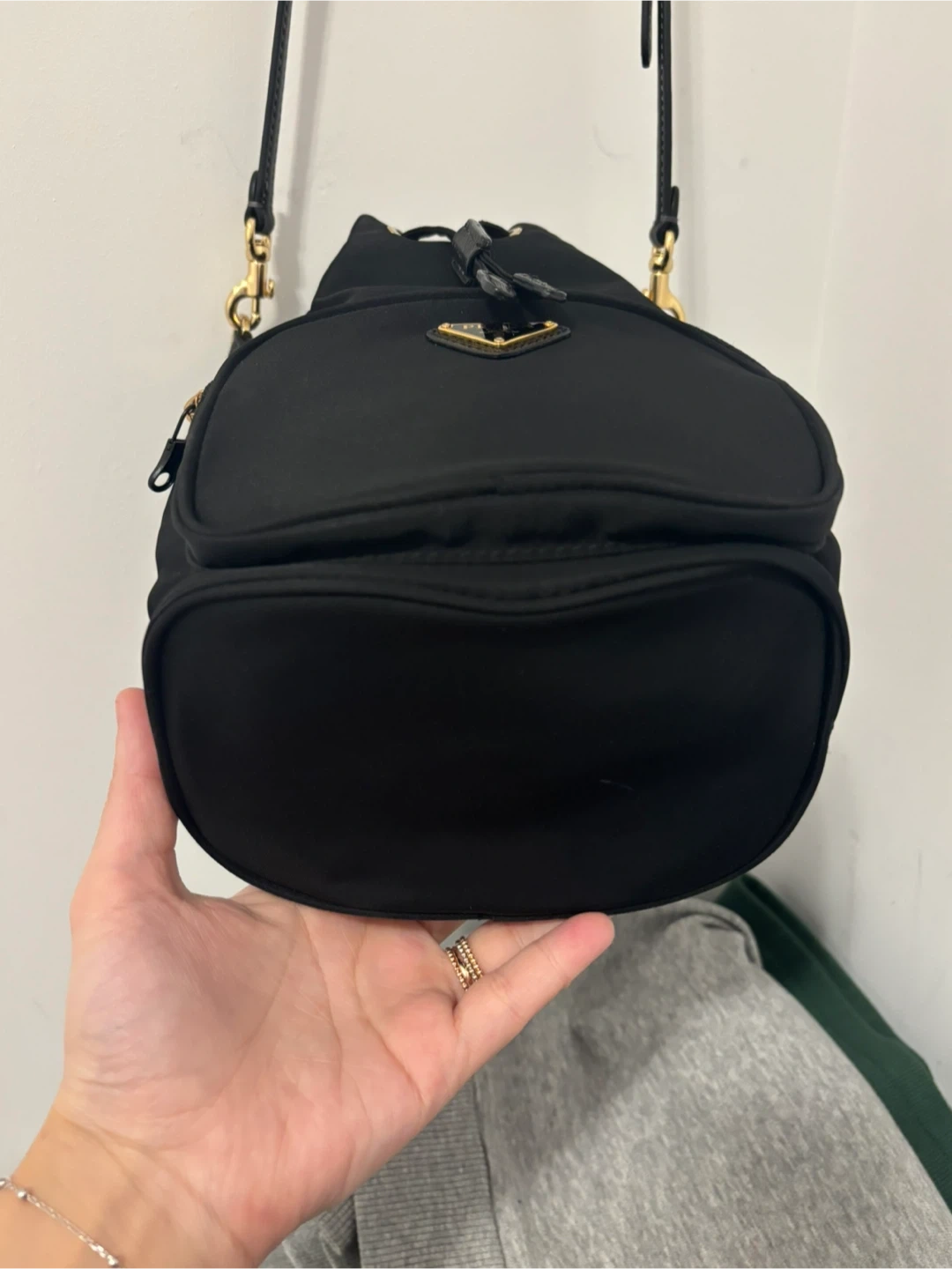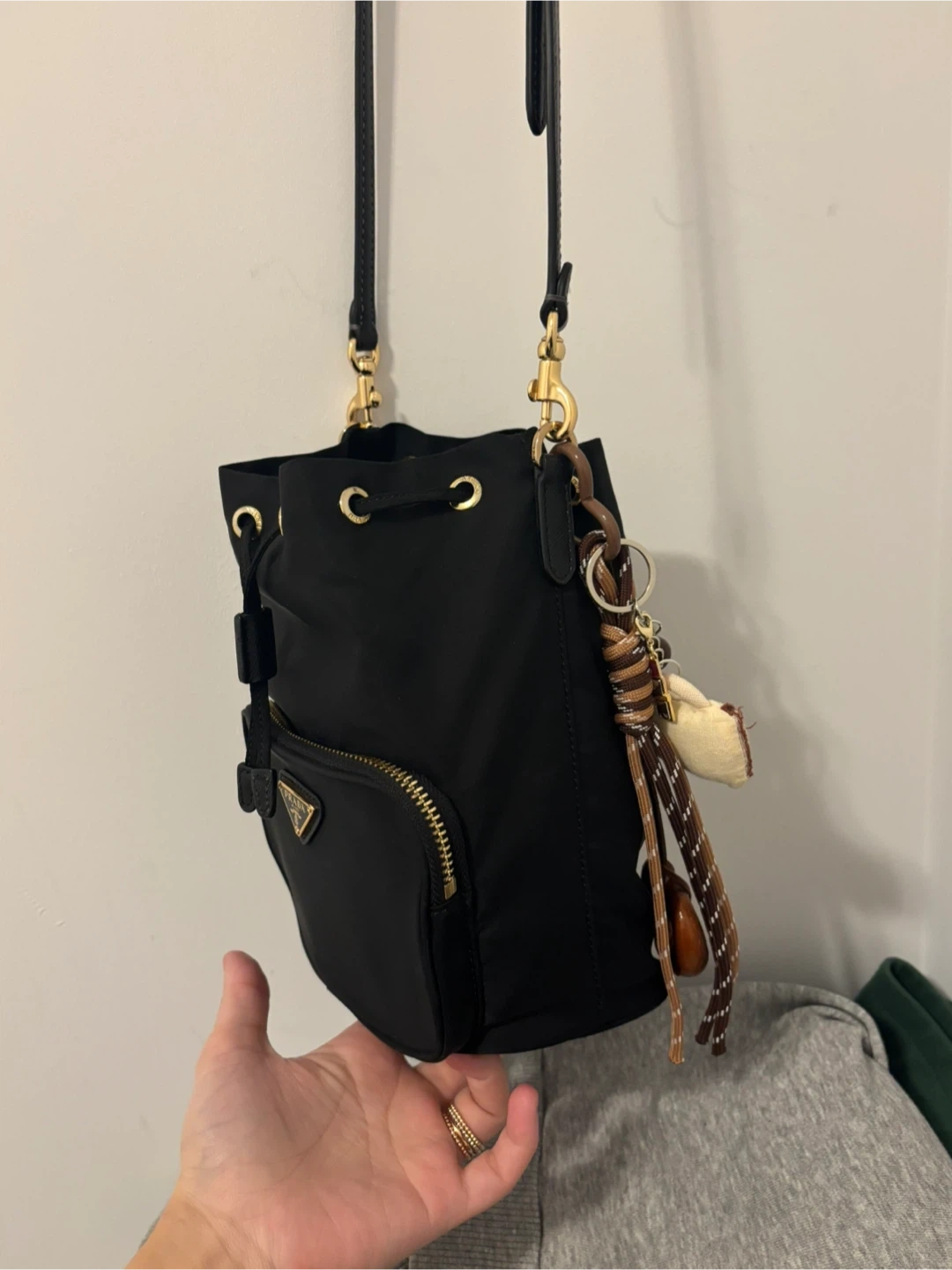 Selling a stylish Prada bucket bag in classic black nylon! It's in great condition and features gold-tone hardware, a drawstring closure, and the iconic Prada logo. Perfect for everyday use or a night out