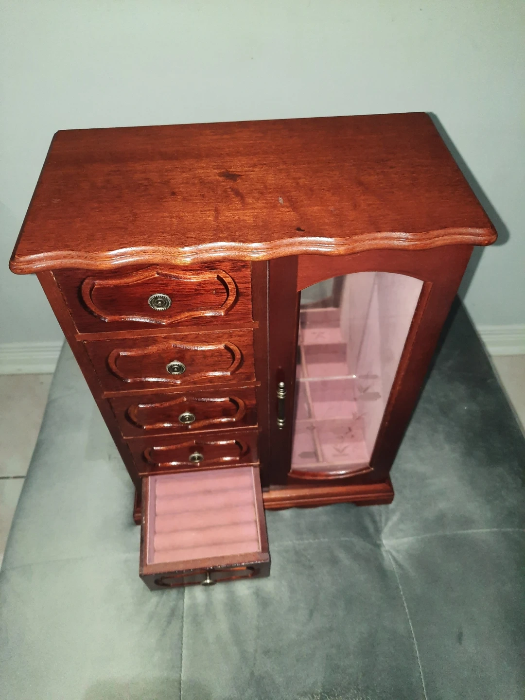 Vintage wooden jewellery box with multiple drawers and a mirrored door. It's lined with pink velvet and has compartments for organizing accessories. Perfect for storing necklaces, rings, and earrings!