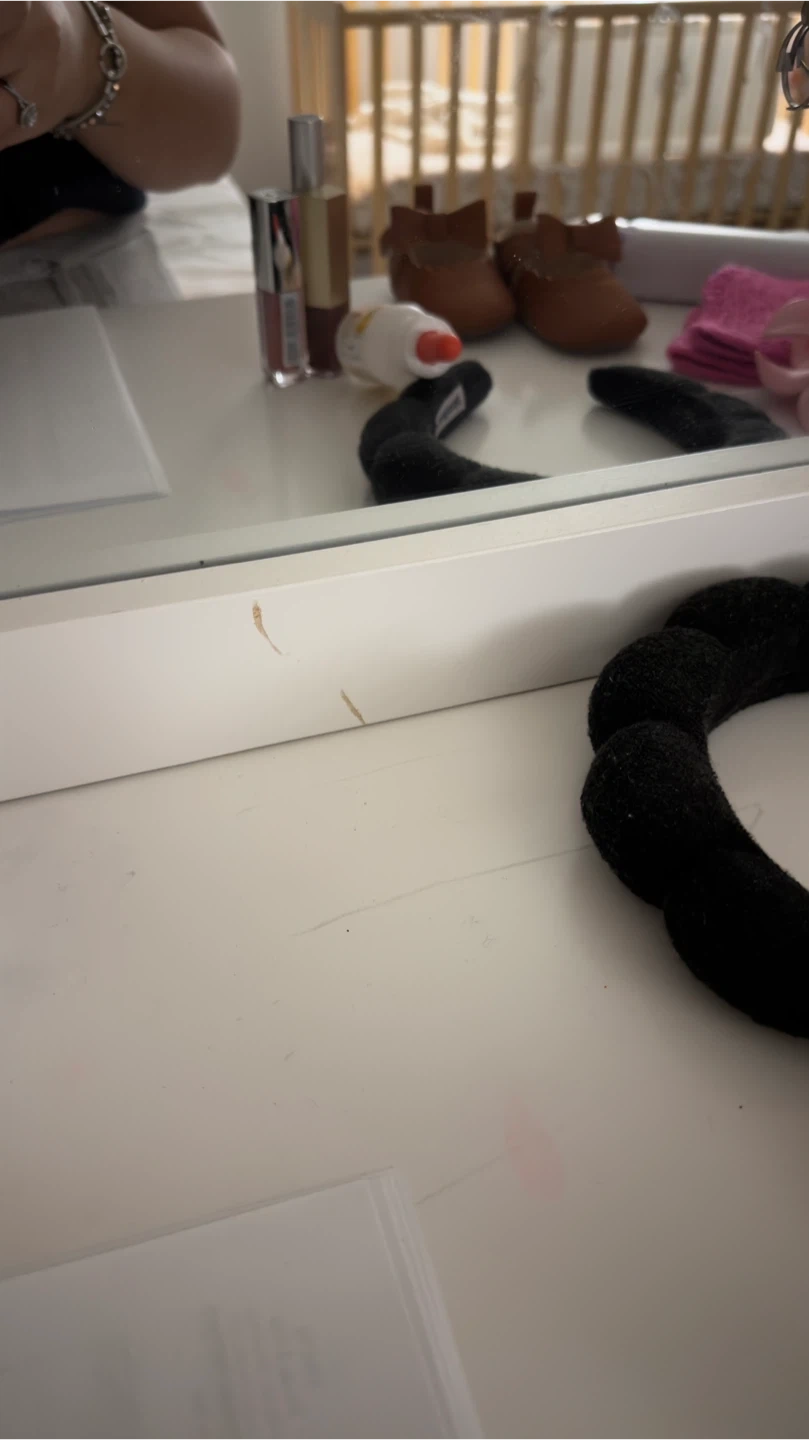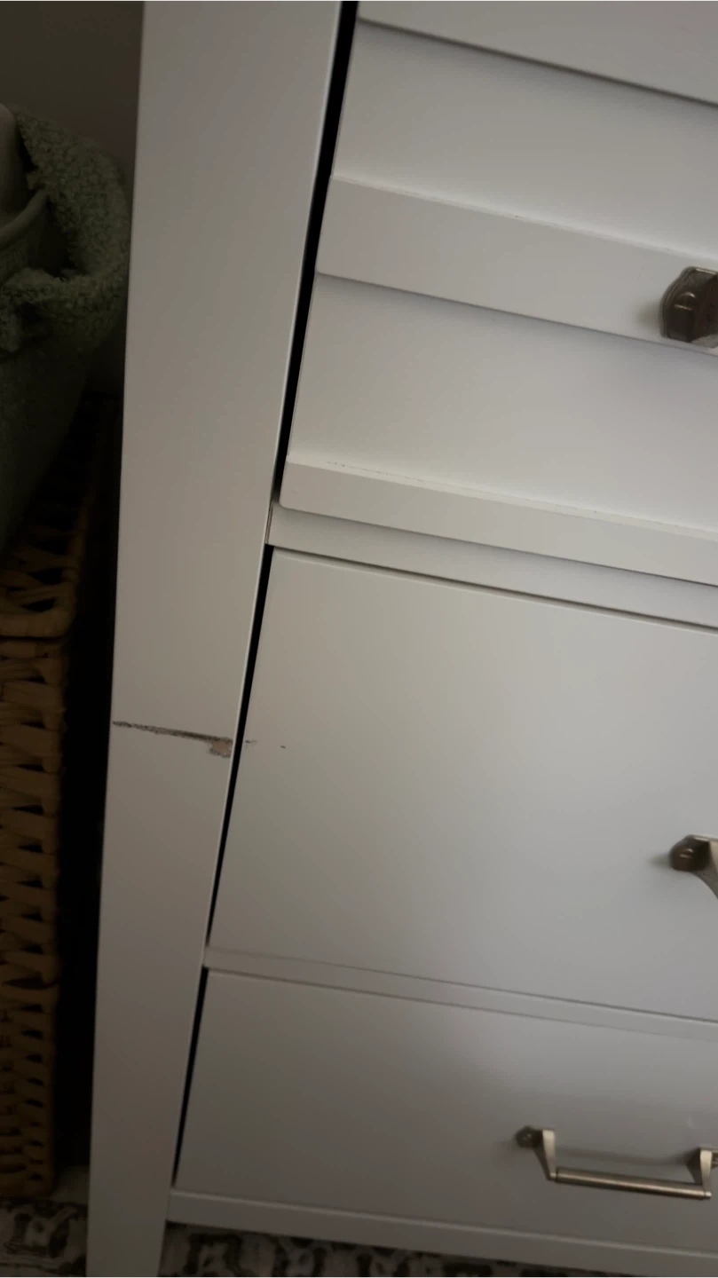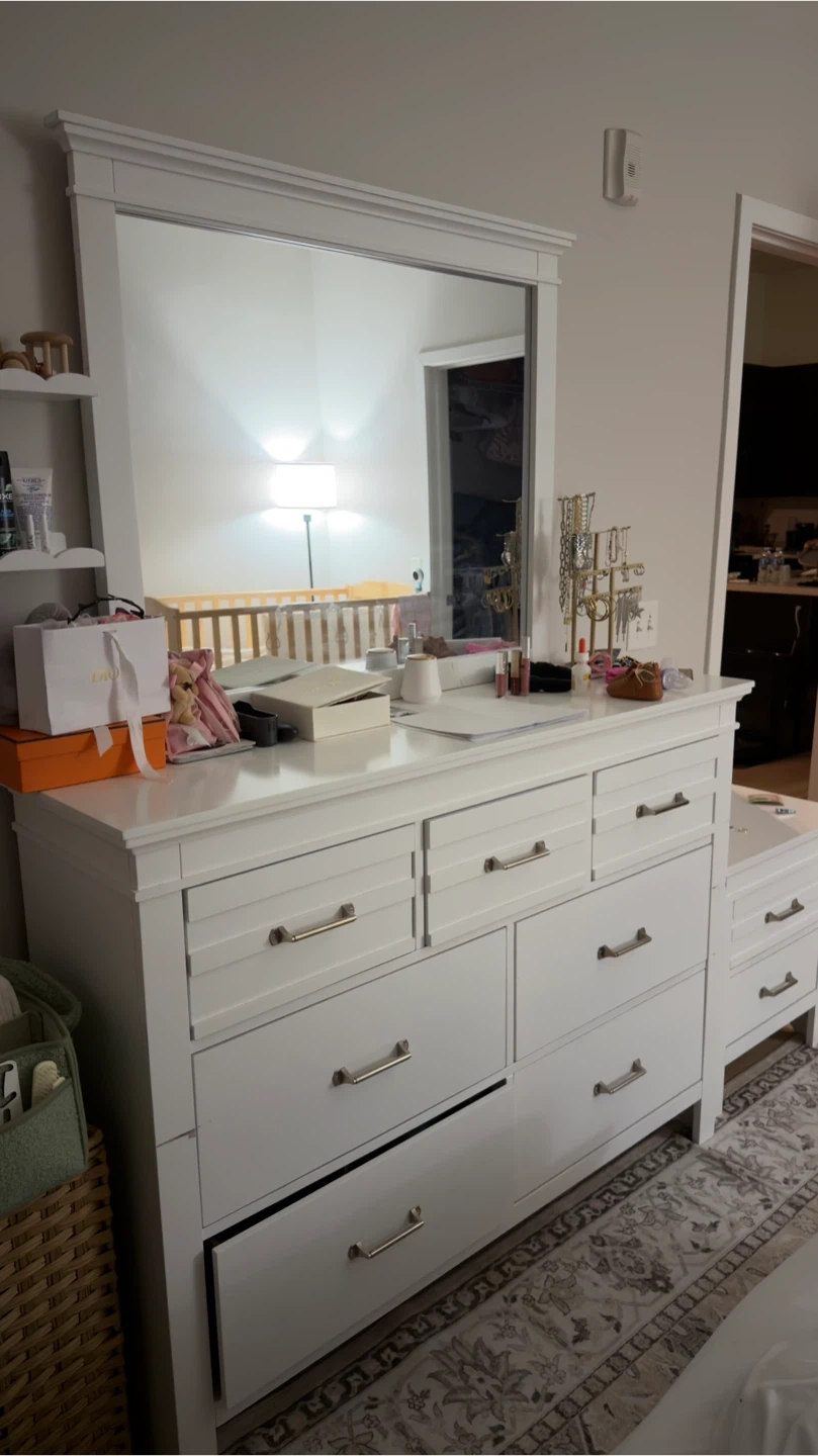 White dresser with a large mirror. It has multiple drawers for storage. Some minor scuffs are present on the dresser frame and top surface.