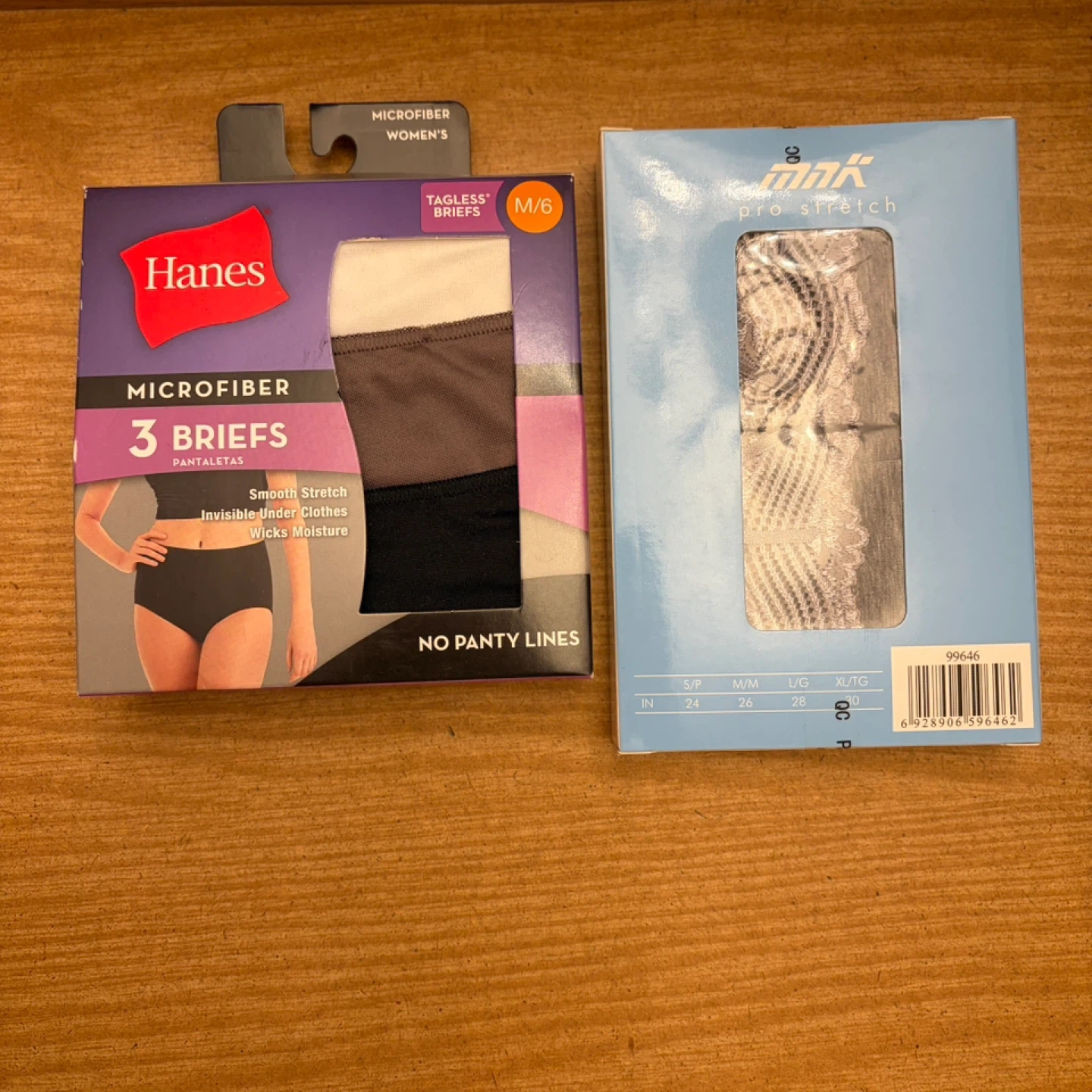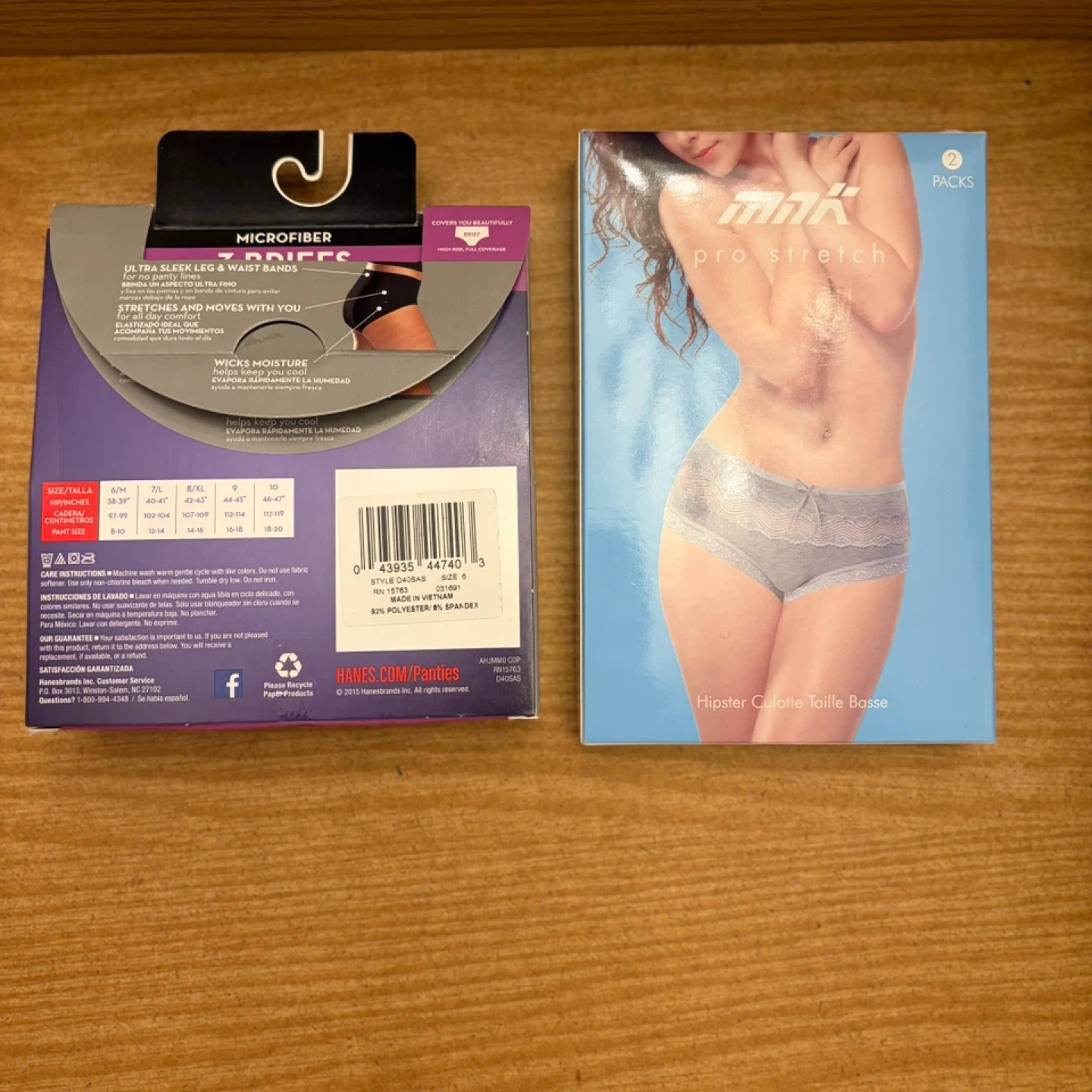 A pack of three Hanes microfiber briefs for women. They feature a tagless design and are made with smooth fabric that wicks moisture. Invisible under clothes with no panty lines. Also a 2 pack of hipsters. Both in size medium (6). BNIB. $10 each pack